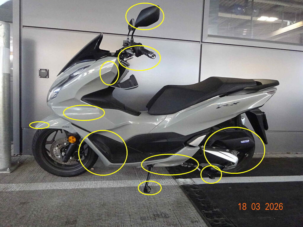 linke Seite Verkleidungen, Ständer, Deckel Motor, Radabdeckung vorne, Lenker, GriffRisiko Mehrschäden nach ZerlegungRoller fahrbarSehr guter Zustand, erst 726km