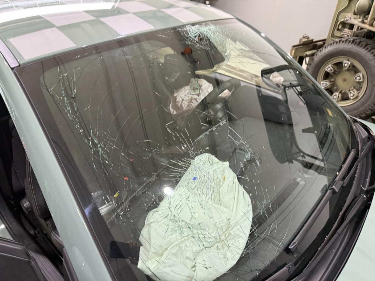 Airbag ausgelöst, Armaturenbrett, Front, Front links, Front rechts, Frontscheibe, Klimakühler, Kotflügel links, Kotflügel rechts, Kühler, Ladeluftkühler, Motorhaube, Scheinwerfer links, Scheinwerfer rechts, Stosstange vorne