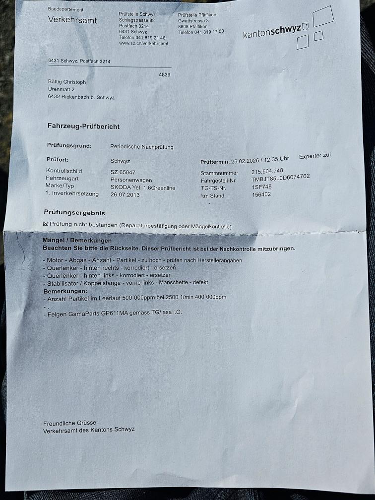 - Partikelfilter nicht i.O. - Querlenker hinten rostig -> müssen ersetzt werden - "Technische Mängel" im Ausweis eingetragen