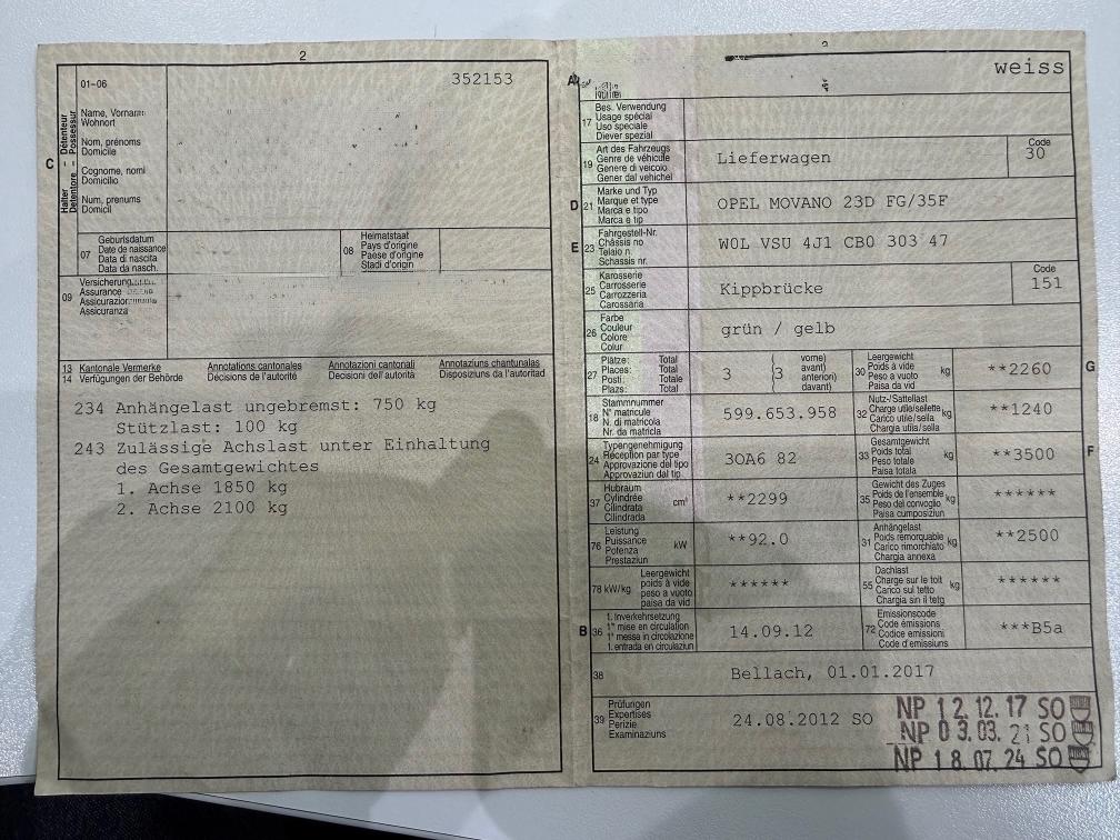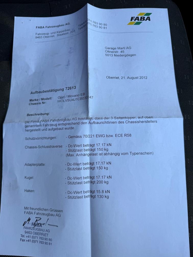 Opel Movano mit voll funktionsfähigem Faba 3-Seitenkipper Anhängerkupplung mit Kugel und Zugmaul, 2.5 To. Anhängelast Fz hat keine Klimaanlage Nur 1 Schlüssel Polster Fahrersitz gerissen Kleiner Oelverlust, waschbar für MFK Antriebswellenmanschetten aussen gerissen Zustand Carrosserie gemäss Fotos (Baustellenfahrzeug)