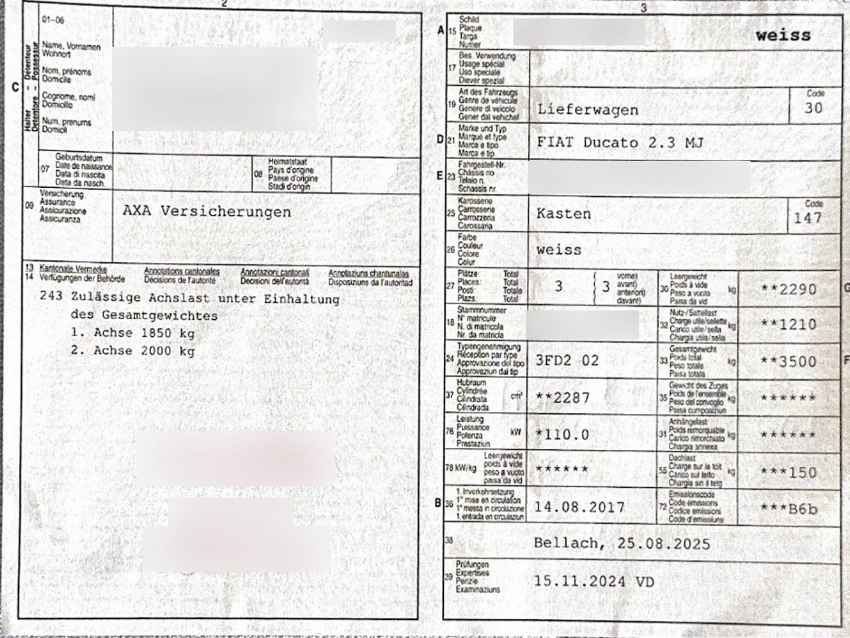 Sitze: Fahrersitz höhenverstellbar, Scheibenwischer vorne mit Intervall, 3-Punkt-Sicherheitsgurte auf allen Plätzen, Elektronisches Stabilitäts-Programm (ESP) mit Berganfahrassistent, Servolenkung, Getriebe: 6-Gang-Getriebe, Elektrische Fensterheber vorne, Türen: Seitliche Schiebetür rechts mit Ausstellfenster, Antiblockiersystem (ABS), Zentralverriegelung mit Fernbedienung, Stärkere Batterie, Wassertemperaturanzeige, Partikelfilter und Oxydationskatalysator, Innenverkleidung des Laderaumes halbhoch, Licht: Tagfahrlicht, Fiat Garantie: 3 Jahre oder 100'000 km (ab 1. Inv.), Gurtstraffer vorne, Abschliessbares Fach im Armaturenbrett, Türen: Flügeltüren hinten verblecht, Schutzstreben hinter dem Fahrersitz, Drehzahlmesser, Airbag: Airbag Fahrerseite, Licht: Nebelschlussleuchte, Räder: Reifenpannen-Kit, Cupholder vorne, Tablet-Halterung, Überrollschutzsystem, Polster: Stoff-Ausstattung