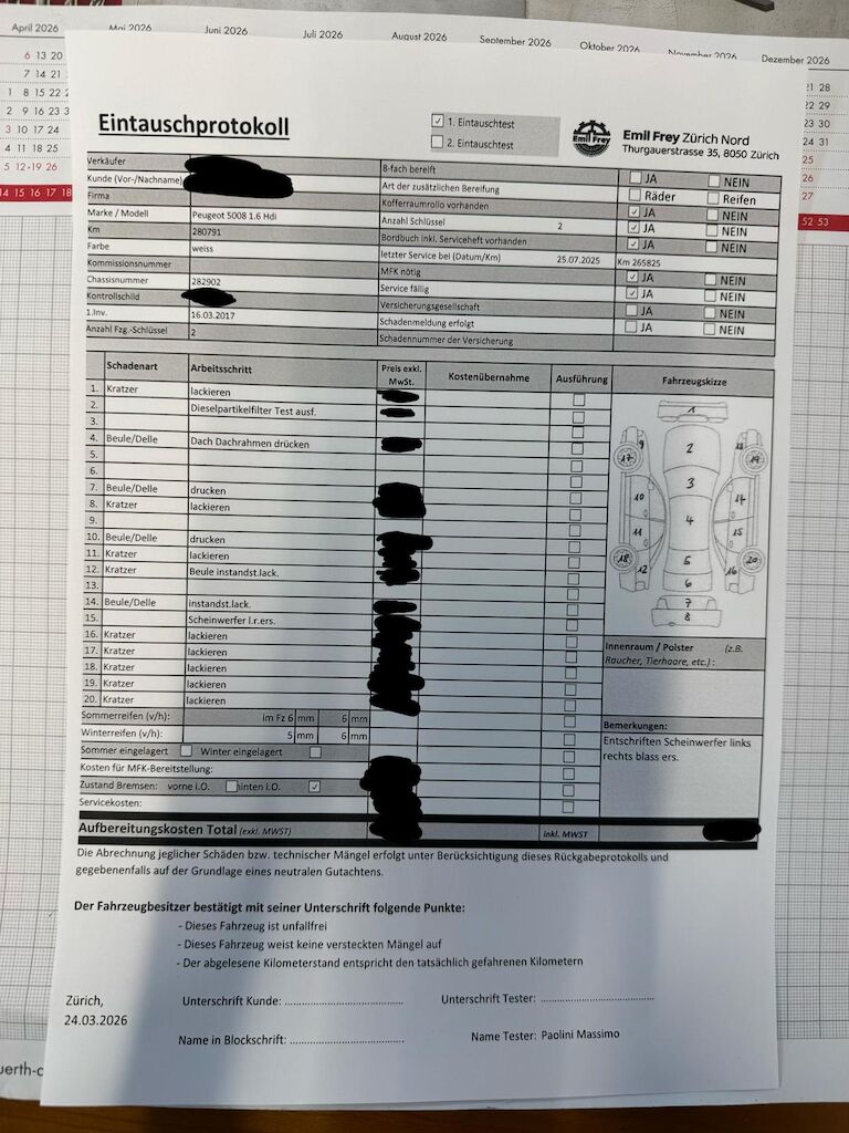 Keine technische Prüfung (Werkstatttest) vorgenommenDiverse Schäden an Karosserie/Lack.Fahrzeug ab Platz, ohne Garantie und Aufbereitung.Keine Gewähr auf die Angaben der Sonder- und Serienausstattung / keine mechanische Prüfung. Fahrzeug wurde unzerlegt expertisiert / keine Haftung für allfällige, nach Demontage bekanntwerdenden Mängel. Fahrzeugbereifung und Ausstattung gemäss Fotos / Fahrzeugkauf auf eigenes Risiko ab Platz ohne Nachwährschaft.- Diverse Dellen und Kratzer am gesamten Fahrzeug!!- Dachrahmen Dellen- Beide Scheinwerfer verblasst muss ersetzt werden- Dieselpartikelfilter getestet ist bestanden- Letzter Service am 25.07.2025 bei 265825 Km