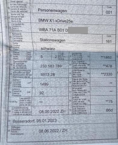 Fahrer und Beifahrer-Airbag Seitenairbag für Fahrer und Beifahrer Reifendruck-Kontrollsystem RDC Elektrische Fensterheber Aussenspiegel elektrisch verstellbar und heizbar Armauflage vorn Automatische Heckklappenbetätigung Regensensor Dynamische Stabilitäts-Control DSC Antiblockiersystem ABS Servotronic Pack Ablage Sport-Lederlenkrad Bordcomputer Multifunktions-Lenkrad Kopfairbags vorne + hinten Dynamische Traktions-Control DTC Park Distance Control PDC hinten Geschwindigkeitsregelung mit Bremsfunktion Klimaautomat 2-Zonen inkl. Mikrofilter Digital audio DAB-Tuner Auto Start Stopp Funktion Rücksitzlehne geteilt umklappbar 40/20/40 Dachreling schwarz Freisprecheinrichtung mit USB-Schnittstelle Keine Gewähr auf die Angaben der Serienausstattungen ConnectedDrive Services Interieurleisten oxidsilber matt Hochvoltbatterie Ladekabel Fussgängerschutz akustisch BMW Service Plus 10 Jahre/ 100'000 km Leichtmetallräder Doppelspeiche 564 Pack Advantage Ottopartikelfilter Aufmerksamkeitsassistent Active Guard Standklimatisierung