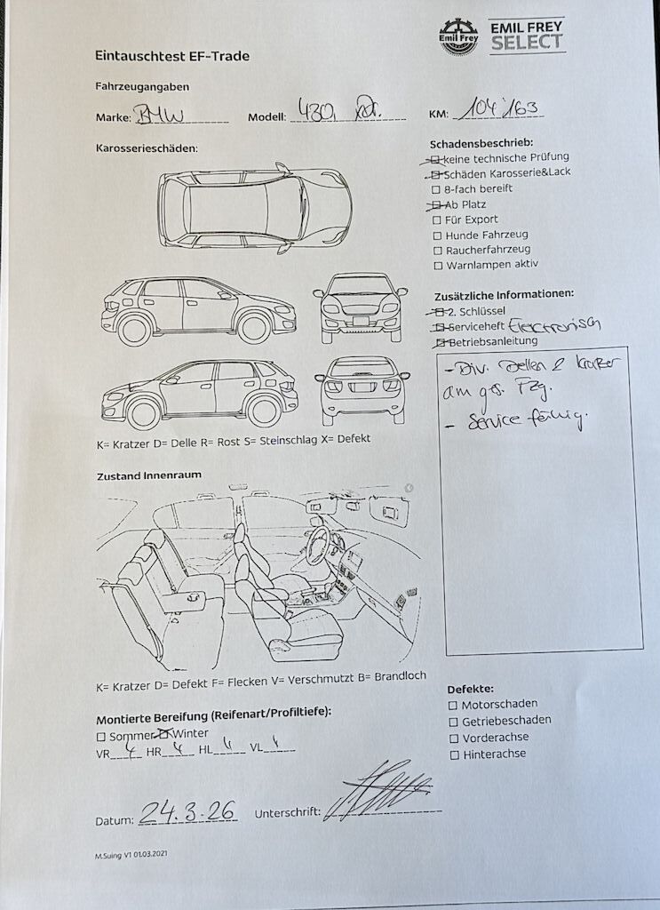 Keine Gewähr auf die Angaben der Sonder- und Serienausstattung / keine mechanische Prüfung. Fahrzeug wurde unzerlegt expertisiert / keine Haftung für allfällige, nach Demontage bekanntwerdenden Mängel. Fahrzeugbereifung und Ausstattung gemäss Fotos / Fahrzeugkauf auf eigenes Risiko ab Platz ohne Nachwährschaft- Div. Dellen und Kratzer am gesamten Fahrzeug.- Service fällig.