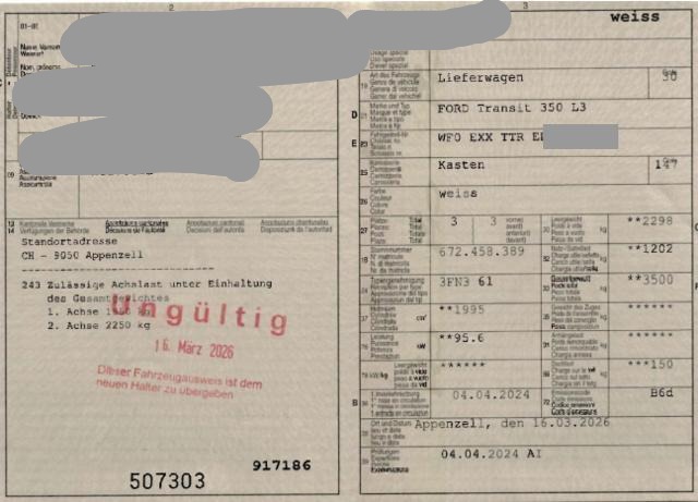 ACHTUNG: ZUSÄTZLICH ZUM RESTWERTGEBOT WIRD EINE HANDLINGS-GEBÜHR VON CHF 500.00 ERHOBEN! ATTENTION : EN PLUS DE L'ENCHÈRE DE VALEUR RÉSIDUELLE, DES FRAIS DE GESTION DE CHF 500.00 CHF SERONT FACTURÉS ! ATTENZIONE: OLTRE ALL'OFFERTA DI VALORE RESIDUO VERRÀ ADDEBITATA UNA COMMISSIONE DI GESTIONE DI CHF 500.00! Der Kilometerstand wurde abgelesen. Gebrauchsspuren und kleinere Vorschäden sind möglich. Keine weitere Bereifung vorhanden. Vor Ort waren: 2 Schlüssel und Ausweis vorhanden. Motor und Getriebe wurde nicht geprüft. Weitere nicht aufgeführte und nicht fotografisch festgehaltene oder verdeckte Schäden sind möglich!