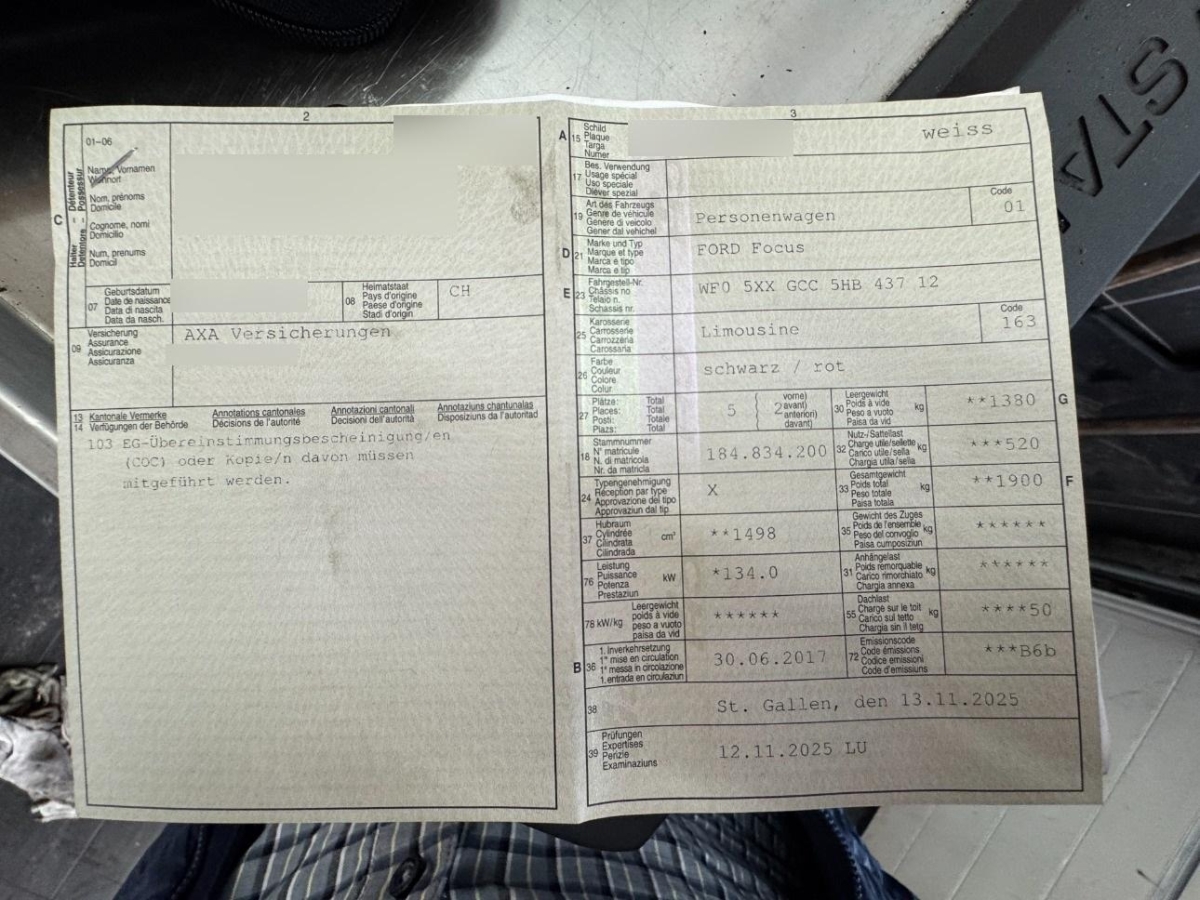 Licht: LED Heckleuchten, Airbag: Seitenairbag für Fahrer und Beifahrer, Licht: Nebelscheinwerfer, Gurtstraffer mit Gurtkraftbegrenzer, Sicherheitslenksäule, Warnblinkautomatik bei Vollbremsung, 2 Zündschlüssel (1 klappbar), Scheibenwischer vorne mit Intervall, Lenkrad und Schalthebelgriff in Leder, Innenraumbeleuchtung, Räder: TPMS Reifendrucküberwachungssystem, Klima: Pollenfilter (Staubfilter), Berganfahrhilfe (Hill Holder), 3-Punkt-Sicherheitsgurte auf allen Plätzen, ISOFIX Kindersitzvorrichtung, Pedalerie mit Aluminiumauflage, Licht: Halogenscheinwerfer, Servolenkung, Wegfahrsperre elektronisch, Polster: Stoff-Ausstattung, Pedal Release System Auskuppelnde Sicherheitspedale PRS, Räder: Reifenreparatur-Set (Tire Fit), Dachhimmel schwarz, Türgriffe aussen in Wagenfarbe, Licht: Nebelschlussleuchte, Airbag: Beifahrer deaktivierbar, Katalysator geregelt, Klima: Klimaanlage, Media: USB-Anschluss, Lackierung: Uni-Lackierung, Laderaumbeleuchtung, ABS, EBD elektronische Bremskraftverteilung, Lenkrad: Lenkrad längs- und höhenverstellbar, Beleuchtetes Handschuhfach, Aussenspiegel in Wagenfarbe, Audiosystem 2 mit DAB+ (Radio/CD, Fernb. 6LS, Aux-In & USB, SYNC Notfallassistent Bluetooth Freisprecheinrichtung, Sitze: Sportsitze vorne, Zentralverriegelung mit Fernbedienung, Höhenverstellbare Gurten vorne, Elektronisches Sicherheits- und Stabilitätsprogramm (ESP), Media: Digitaler Radioempfang (DAB/DAB+), Mittelkonsole, Heckscheiben-Wisch-/Waschanlage, Räder: 4 Leichtmetallfelgen 17J mit Pneu, Laderaumabdeckung, Bordcomputer, Klima: Zuheizer, Elektrische Fensterheber vorne, Aussenspiegel elektrisch verstellbar, Airbag: Fahrer und Beifahrer, Heckscheibenheizung, Licht: LED-Tagfahrlicht, Getönte Scheiben, Staufach vorne in der Mittelkonsole, Einstiegsschienen mit Logo, Styling-Kit, 2 Steckdosen in der Mittelkonsole (vorne und hinten), Seitenschweller schwarz genarbt, Getriebe: 6-Gang-Getriebe, Sitze: Rücksitzlehne geteilt abklappbar, Kopfstützen hinten, Airbag: Window-Kopfairbags, Kartentasche an der Rückenlehne, Sportlenkrad, MyKey, Teppichfussmatten vorne, Licht: Drittes Bremslicht, Ford Power Start, Fahrwerk: Sportfahrwerk, Heckspoiler in Wagenfarbe, Aussenspiegel rechts und links beheizbar und elektrisch verstellbar