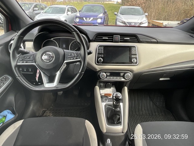 Lenkrad: Sportlenkrad, Sonnenblenden mit Make-Up-Spiegel auf Fahrer- und Beifahrerseite, Airbag: Airbag Beifahrer deaktivierbar, Assist: Geschwindigkeitsbegrenzer, Bordcomputer mit 5''-Farbdisplay, Scheiben verdunkelt ab B-Säule, Lenkrad: Lenkrad längs- und höhenverstellbar, Fensterheber vorne elektrisch, mit Komfortfunktion für Fahrerseite, Servolenkung geschwindigkeitsabhängig, Garantie: Garanie 3 Jahre oder 100'000 km (ab 1. Inv.), Katalysator geregelt, Media: Bluetooth-Schnittstelle für Mobiltelefon und Audiostreaming, Steckdose, 12 Volt, vorne, Assist: Intelligenter Autonomer Notbrems-Assistent mit Kollisionswarnsystem, Dekor: Dekoreinsätze an Schaltknauf in Chrome, Airbag: Fahrer- und Beifahrerairbag, Kopfairbags und Seitenairbags vorne, Assist: Antiblockiersystem (ABS) mit elektronischer Bremskraftverteilung (EBD) und NISSAN Brems-Assistent, Aussenspiegel in Wagenfarbe, elektrisch anklappbar, mit integrierten LED-Blinklichtern, Getriebe: 5-Gang-Getriebe, Nebelschlussleuchte, Räder: 16"-Flex-Felgen GENKI (zweifarbig) mit Bereifung 195/55 R16, Drittes Bremslicht, Laderaumabdeckung, Dekor: Instrumententafel in Kunstleder, beige - oben weich unterschäumt, Lenkrad: Lenkradfernbedienung für: - Audiosystem - Bluetooth-Schnittstelle für Mobiltelefone - Bordcomputer, Sitze: Vordersitze heizbar, INTELLIGENT KEY mit Start-/Stopp-Knopf, Sitze: Fahrersitz höhenverstellbarr, Stossfänger Stylingelemente für Front und Heck, Seitenleisten und Spiegelkappen wahlweise in Schwarz oder Chrome, Drehzahlmesser, Assist: Tempomat, Kofferraumbeleuchtung, Licht: Fahrlichtautomatik, Warnsignal für nicht angelegte Sicherheitsgurte, Dachspoiler, Assist: Berganfahr-Assistent, Wegfahrsperre elektronisch, Garantie: Garanie 3 Jahre Lackgarantie, Garantie: 12 Jahre Garantie gegen Durchrostung, Media: Dachantenne, 300 mm, Heckscheibenheizung, Räder: Reifenreparatur-Set, Media: Digitaler Radioempfang (DAB/DAB+), Assist: Rückfahrkamera in Farbe, Sitze: Rücksitzbank asymmetrisch (60:40) umklappbar, Zentralverriegelung mit Funkfernbedienung, Elektronisches Stabilitäts-Programm (ESP), Media: USB-Schnittstelle, iPod-Gateway, Lackierung: Uni-Lackierung, Dekor: Kniepolsterung an der Mittelkonsole in Kunstleder, beige, Licht: LED-Tagfahrlicht, Räder: Reifendruck-Kontrollsystem (TPMS), Dekor: Türinnenverkleidung vorne mit Einsätzen in Kunstleder, beige, Media: Audiosystem - MP3-Wiedergabe - 7"-Farbdisplay mit Touchscreen - 4 Lautsprecher in den Vordertüren und in der A-Säule - AUX-Eingang - Apple CarPlay und Android Auto, 3-Punkt-Sicherheitsgurte auf allen Plätzen, Aussenspiegel beheizbar, Heckscheiben-Wisch-/Waschanlage, Assist: Warnblinkautomatik, Dekor: Türinnengriffe verchromt, Polster: Sitzbezüge Stoff, Stopp-/Start-System, Assist: Regensensor für Scheibenwischer vorne, Assist: Chassis Control Technologie (CCT) Aktive Spurkontrolle, Aktive Fahrkom- fortregelung, Licht: Halogen-Hauptscheinwerfer, Assist: Verkehrszeichenerkennung, ISOFIX-Kindersitz-Befestigungspunkte vorne auf dem Beifahrersitz und hinten auf den äusseren Plätzen, Kopfstützen auf allen 4 Hauptplätzen, manuell einstellbar, Lenkrad, Schalthebelgriff und Handbremshebelgriff in Leder, Türen: Türaussengriffe in Wagenfarbe lackiert, vorne - versteckte Griffe an den hinteren Türen in Schwarz, Licht: Nebelscheinwerfer, Ablagefach - in der Mittelkonsole - in den vorderen Türen - Getränkehalter vorne und hinten, Leseleuchten vorne