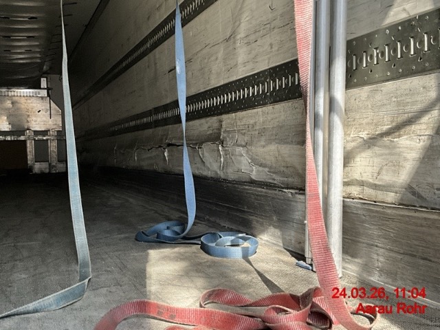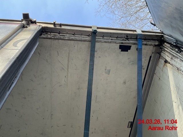 Heck: Portalrahmen ausgerissen, Flügeltüre rechts beschädigt. / Vorbestandene Schäden: Vorne rechts: Ecke eingedrückt und prov. repariert. Seite rechts: diverse Schäden an der ganzen Seitenwand innen und aussen. Seite links: diverse Schäden an der ganzen Seitenwand innen und aussen