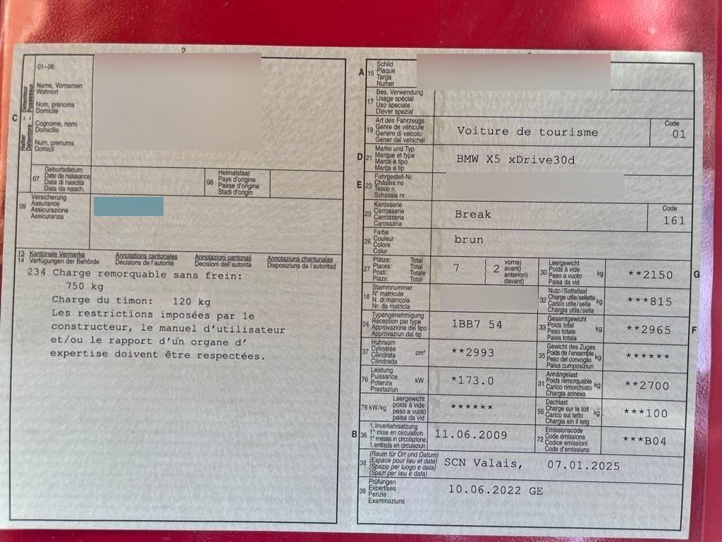 Verbandskasten, Schliesshilfe für Heckklappe, Info-Display, Aufklappbare Heckscheibe, Klimatisierungsautomatik, Vordersitze mechanisch längsverstellbar, Getriebe: 6-Stufen-Automat Steptronic, Lenkrad: Lenkrad längs- und höhenverstellbar, Mittelarmlehne vorne, Wegfahrsperre elektronisch, Lenkrad und Schalthebelgriff in Leder, Digital Uhr, Laderaumabdeckung, Gepäckraumboden abschliessbar, Innen- und Aussenspiegel automatisch abblendend, Leuchtweitenregulierung von innen, 2 Steckdosen in der Mittelkonsole (vorne und hinten), Abblendlichtausschaltverzögerung 'Follow me home', Geteilte Heckklappe, Assist: Tempomat mit Bremsfunktion, Scheibenwischer vorne mit Intervall, Elektronische Differentialsperre (ADB-X), Stereolautsprechersystem mit 6 LS, Wartungsintervall-Anzeige, Pollenfilter (Staubfilter), Stossstangen und Aussenspiegel in Wagenfarbe, Interieurleisten Graphitan matt, Automatische Stabilitäts-Control (ASC), Fussraumbeleuchtung vorne, Start-/Stop-Knopf, Airbag: Airbag Fahrer und Beifahrer, Check-Control-System, Airbag: Seitenairbag für Fahrer und Beifahrer, Park Distance Control vorne und hinten, iDrive-System, Stoff-Ausstattung, Aux-In Anschluss, Nebelscheinwerfer, Beide Make up-Spiegel beleuchtet, Reifen mit Notlaufeigenschaft, Veloursfussmatten vorne und hinten, Drittes Bremslicht, Steckdose im Kofferraum, Dynamische Stabilitätskontrolle (DSC), Handschuhfach, Antiblockiersystem (ABS), Elektronische Parkbremse, Bordcomputer, Assist: Anfahrassistent, Oelstandsanzeige, Frontscheibe Verbundglas, Heckscheiben-Wisch-/Waschanlage, Aussenspiegel rechts und links beheizbar und elektrisch verstellbar, Hill Descent Control (HDC), Elektrische Fensterheber vorne + hinten, Bremsbelag-Verschleissanzeige, Gurtstraffer vorne, Mittelarmlehne hinten, Allradantrieb permanent, Reifendruckverlust-Warnsystem, Lichtwarnsummer, Befestigungsösen im Laderaum, Tagfahrlicht, Rücksitzlehne geteilt abklappbar, Vordersitze mit elektrischer Höhen-, Lehnen-, und Neigungseinstellung, Automatische Umluftkontrolle, Höhenverstellbare Gurten vorne, Sitzbelegungserkennung für Beifahrersitz, Abschliessbare Radschrauben, Zentralverriegelung mit Fernbedienung, Nichtraucherausführung, Servolenkung geschwindigkeitsabhängig, Lenkrad: Multifunktionslenkrad, Scheibenwaschdüsen beheizt, Window-Kopfairbags, Tageskilometerzähler, Leseleuchten vorne, Seitenaufprall-Schutzsystem, Bremsassistent (BAS), Grün getönte Scheiben, 3 Kopfstützen hinten, Drehzahlmesser, Anbauteile in Wagenfarbe, Radio BMW Professional, Aktive Kopfstützen, Aussentemperaturanzeige, Aktivkohlefilter (Geruchsfilter), Sicherheitstrennnetz oder /-gitter im Gepäckraum, Partikelfilter und Oxydationskatalysator, Cupholder vorne und hinten, ISOFIX Kindersitzvorrichtung, Lackierung: Uni-Lackierung, Assist: Cornering Brake Control (CBC), Armlehne vorne mit Ablagefach, Licht: Nebelschlussleuchte, Leichtmetallfelgen im Sternspeiche 209 18J mit Pneu, Ausstiegsleuchten in den Türen, Version 7: Orte