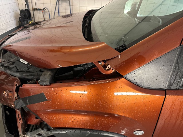 Front links eingedrückt. Frontblech/Maskenblech eingedrückt. Längsträger vorne links gestaucht. Fahrzeugvorbau verschoben.