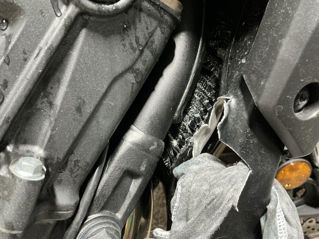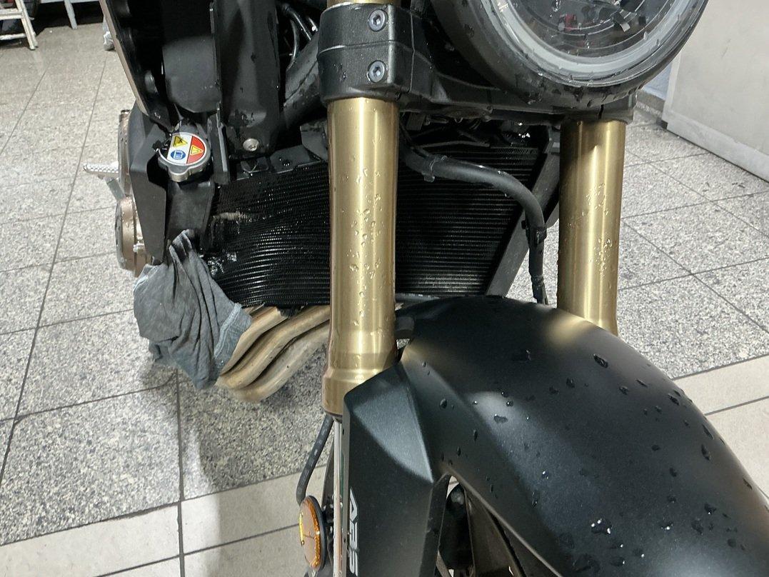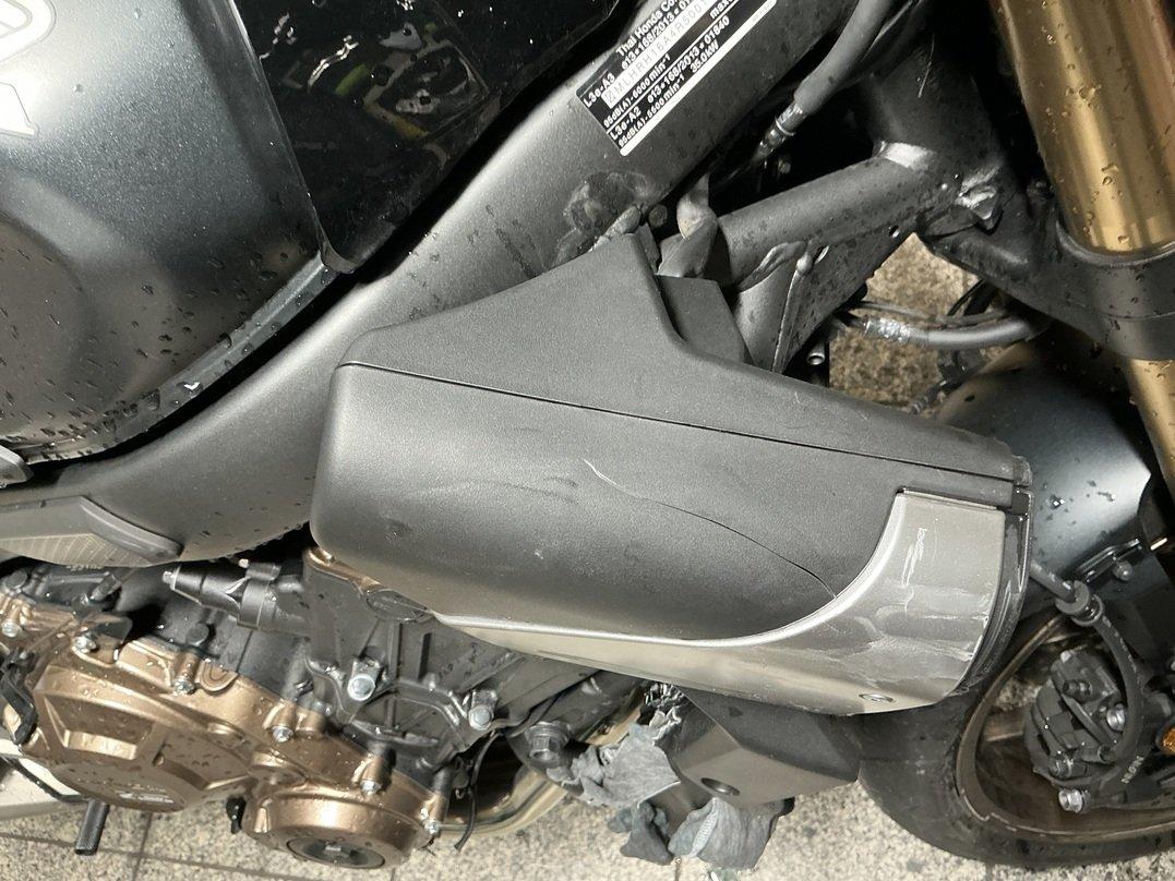 Choc côtés droit et gauche Jantes légèrement pliées, rayées Radiateur cassé Fourche et T de fourche sous réserve Carters, côtés droit et gauche, râpés Divers carénages cassés