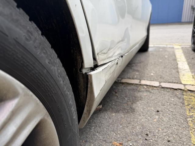 Rechte Seite beschädigt. Anstoss rechts im Bereich der C-Säule. Schweller rechts ist eingedrückt. Tür hinten rechts ist eingedrückt.