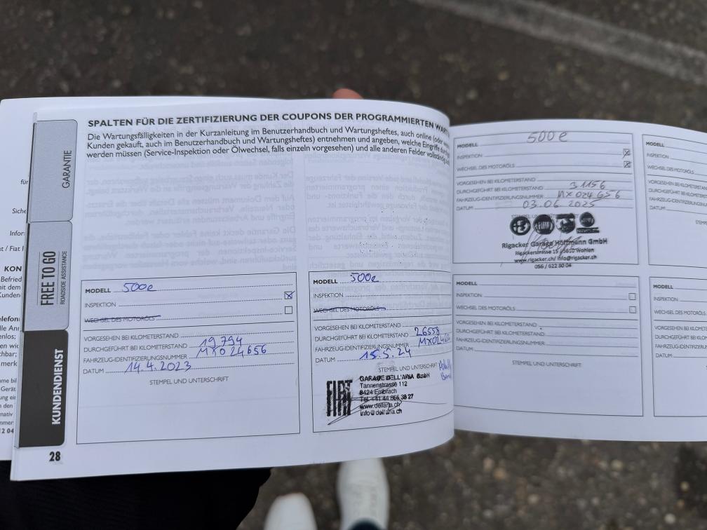 Sehr gepflegtes Fahrzeug, Bild Nummer 2 und 3 mit den Sommerräder. Dise wurden nicht Live gesehen, haben jedoch gemäss Kunde keine Beschädigungen. Winterreifen erst ca. 500km alt. Batterie hat noch die originale Garantie von Fiat. Am Fahrzeug sind keine Mängel bekannt, Bilder so gut wie möglich gemacht. Kundenvorstellung liegt bei mind. 13'000.-, darunter wird es keinen Zuschlag geben. Kein Werkstatttest durchgeführt. Am Fahrzeug wurde kein Werkstatttest gemacht (Für sichtbare oder nicht sichtbare Mängel wird nicht gehaftet). Wir testen & kontrollieren nicht alle Funktionen vom Fahrzeug. Das Risiko liegt somit vollumfänglich beim Käufer. Um Missverständnisse zu vermeiden kann das Fahrzeug auf Voranmeldung besichtigt & getestet werden, sollten Sie davon bewusst kein Gebrauch machen dann liegt die Verantwortung bei Ihnen. Nachdem der Höchstbietende den Zuschlag erhalten hat, gibt es keine Nachverhandlung, auch wenn nicht deklarierte Mängel zum Vorschein kommen sollten. Ab Platz ohne Garantie, Wandelung und Minderung werden wegbedungen.