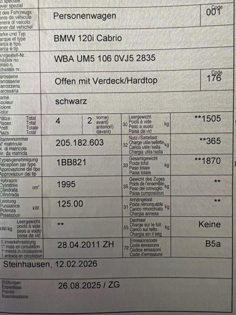 MFK 26.08.2025 Neue Winterreifen Pirelli montiert am 16.02.2026 Service frisch ausgeführt 16.02.2026 Steuerkette und Oelpumpe frisch ersetzt 21.03.2026 Evtl. Kurbelwellen- oder Pleuellagern Geräusche (ohne Gewähr) Am Fahrzeug wurde kein Werkstatttest gemacht (Für sichtbare oder nicht sichtbare Mängel wird nicht gehaftet). Wir testen und prüfen nicht alle Funktionen vom Fahrzeug. Das Risiko liegt somit vollumfänglich beim Käufer. Nach Erhalt des Zuschlags, gibt es keine Nachverhandlung, auch wenn nicht deklarierte Mängel zum Vorschein kommen. Ab Platz ohne Garantie oder Gewährleistung, Wandelung und Minderung werden wegbedungen. Der Verkauf erfolgt ab Platz, ohne Garantie, ohne Gewährleistung und ohne Rücknahme. Das Fahrzeug wurde technisch nicht weiter geprüft. Es können weitere Mängel / Schäden bestehen, die dem Verkäufer nicht bekannt sind. Für Rückfragen Ciriaco Di Giampaolo 079 784 30 30