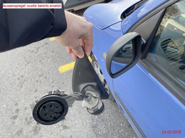 Seite links: Aussenspiegel abgebrochen (bereits ersetzt), Türe links eingedrückt/zerkratzt, Türgriff zerkratzt, Seitenwand hinten links eingedrückt/zerkratzt, Stossstange hinten links zerkratzt / Vorschäden: Gebrauchsspuren