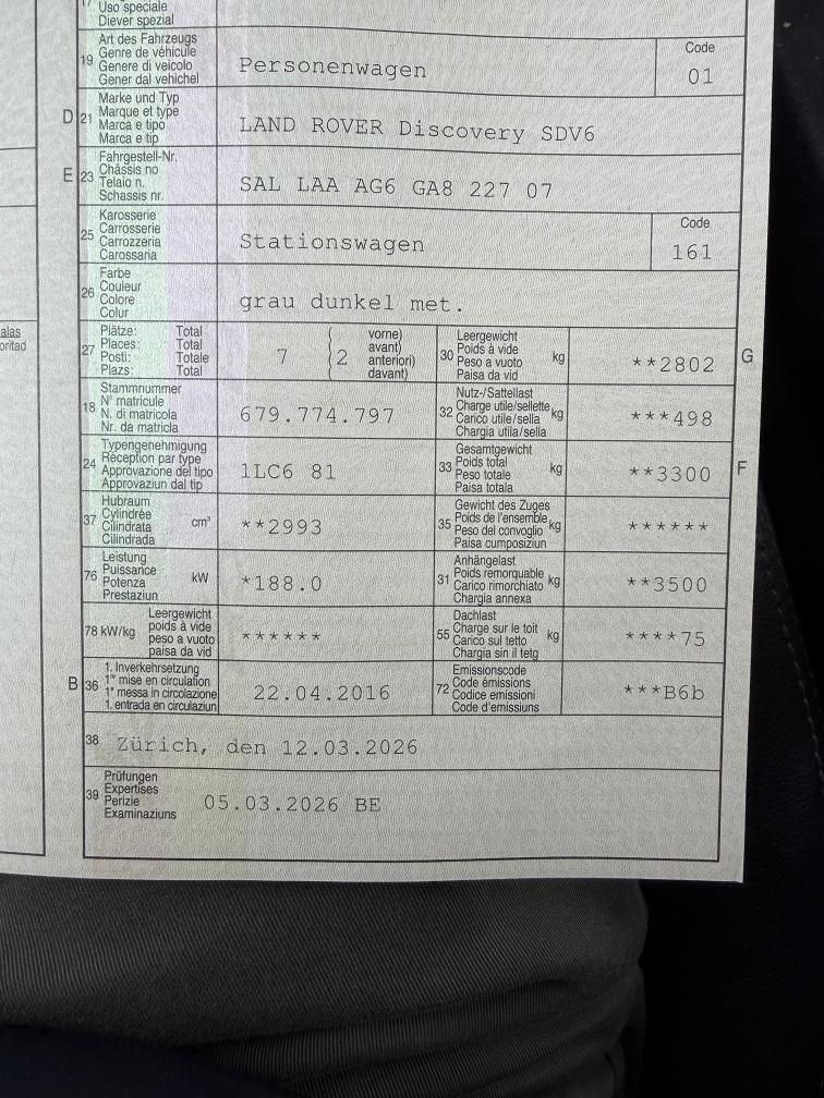 Land Rover Discovery 3.0SDV6 Graphit / MFK 03.2026 Fahrzeug und Schäden wie gesehen, ab Platz, ohne Garantie und Gewährleistung.