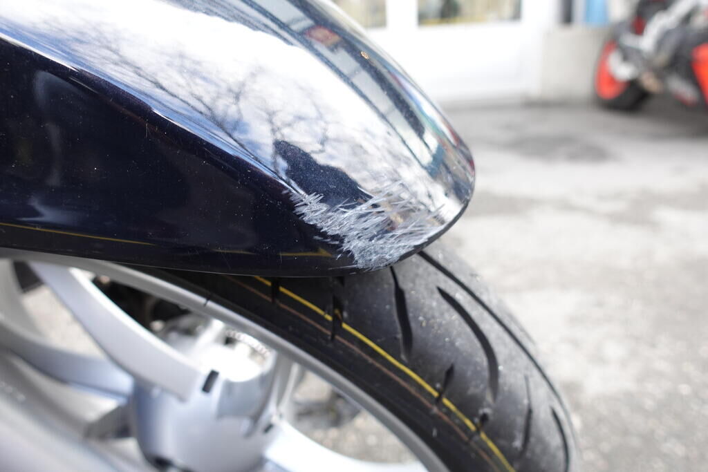 Choc latéral droit: Top case, cale-pied passager, protection thermique échappement, échappement, rétroviseur, levier frein avant, couverture thermique, tablier, carénage latéral avant, bas de caisse, plancher, clignotant avant, pare-boue avant, jante et pneu avant; endommagés. Motor Getriebe Vorderachse Hinterachse Airbags ausgelöst: 0 unbekannt ( Abfallcode 16.01.04ak )