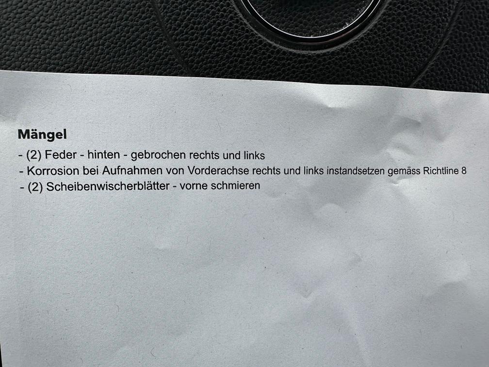-Fahrzeug läuft einwandfrei,Kunde ist bis anhin gefahren. -8-fach Komplettrad -Serviceheft ist nicht mehr auffindbar alter Mann. -Das Fahrzeug war aber immer bei der Garage Ruckstuhl in Winterthur im Service -Fahrzeug hat Technische Mängel siehe Fotos -Fahrzeug hat aussen diverse Kampfspuren siehe Bilder,alter mann ist gefahren. -wir haben kein Interesse am Fahrzeug **Fahrzeug muss nach Zuschlag innert 3 Tagen abgeholt und bezhalt werden** **Am Fahrzeug wurde kein Werkstatttest gemacht (Für sichtbare oder nicht sichtbare Mängel wird nicht gehaftet). Wir testen & kontrollieren nicht alle Funktionen vom Fahrzeug. Das Risiko liegt somit vollumfänglich beim Käufer. Um Missverständnisse zu vermeiden kann das Fahrzeug auf Voranmeldung besichtigt & getestet werden, sollten Sie davon bewusst kein Gebrauch machen dann liegt die Verantwortung bei Ihnen. Nachdem der Höchstbietende den Zuschlag erhalten hat, gibt es keine Nachverhandlung, auch wenn nicht deklarierte Mängel zum Vorschein kommen sollten. Ab Platz ohne Garantie, Wandelung und Minderung werden weg gebunden.