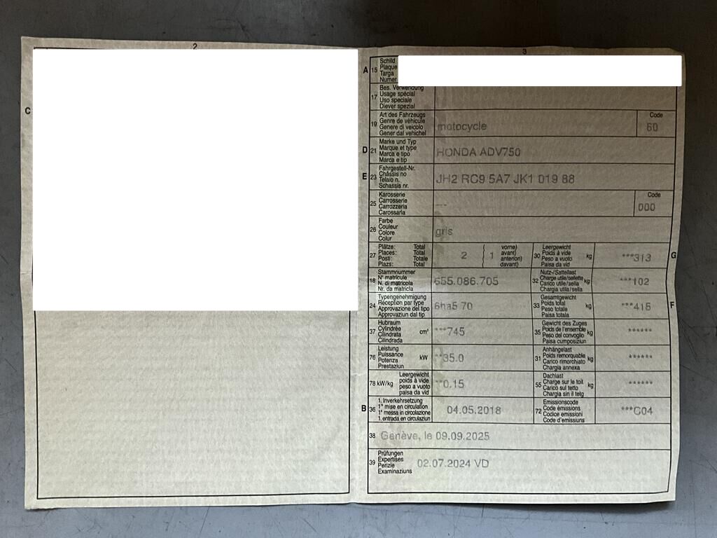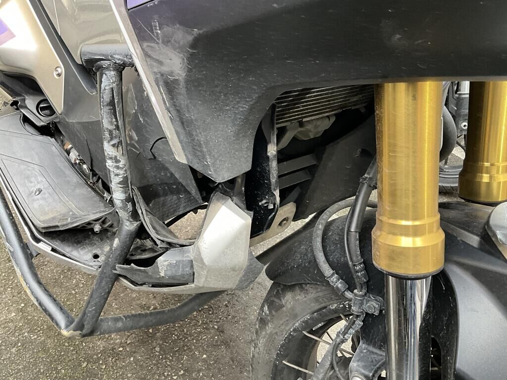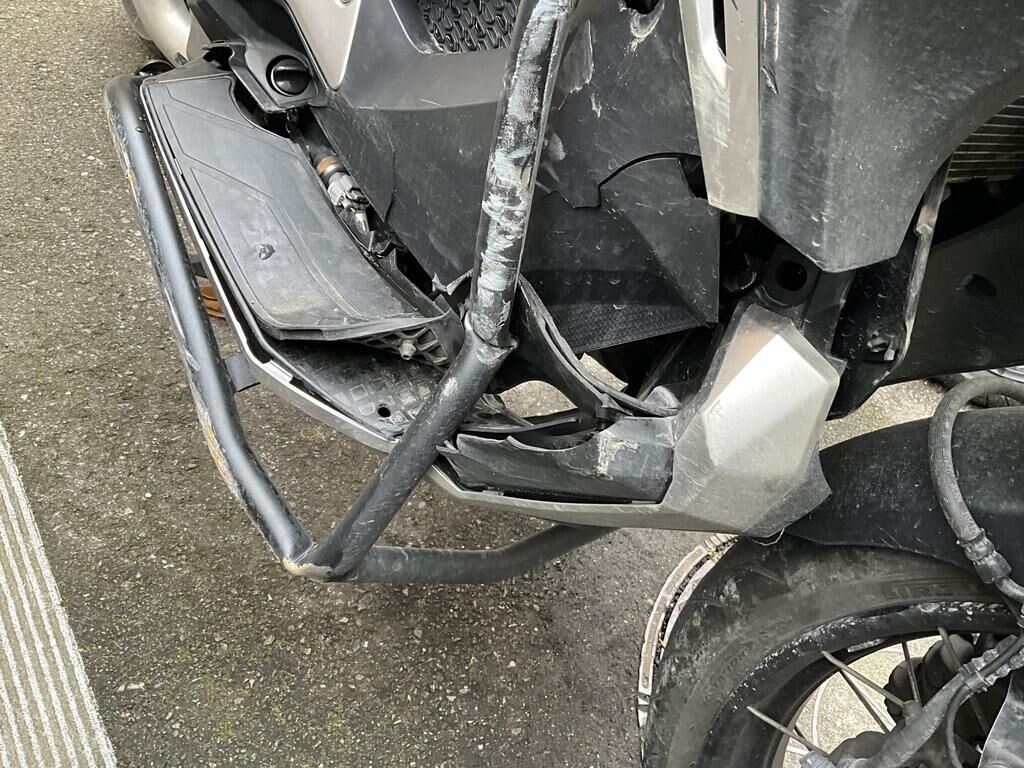 Roue AV, fourche, carénages flanc DR, plancher DR, levier DR, échappement, arceau de protection, poignée de maintient ARD endommagés. Motor Getriebe Vorderachse Hinterachse Airbags ausgelöst: 0 unbekannt ( Abfallcode 16.01.04ak )