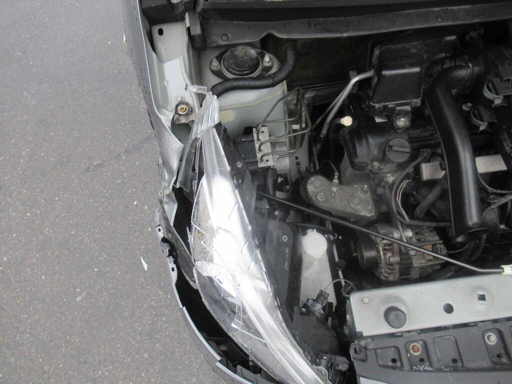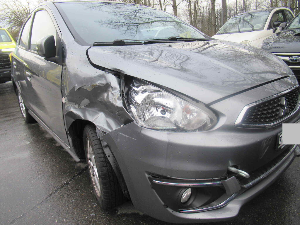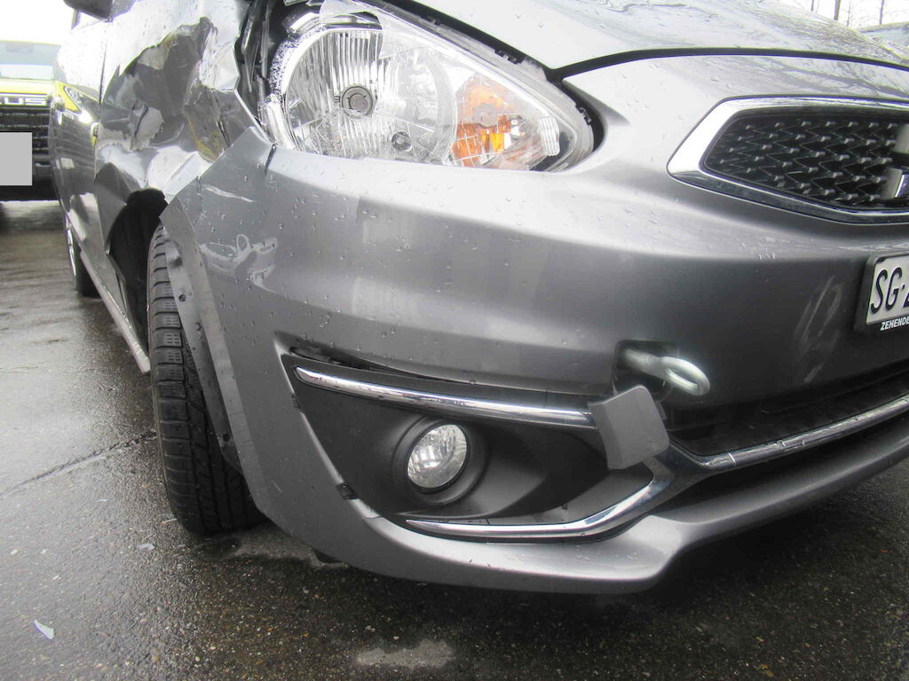 Beschädigung Stossfänger, Kotflügel, Kotflügelhalter, Scheinwerfer, Motorhaube, Rad nach hinten verschoben, Türe vorne rechts Motor Getriebe Vorderachse Hinterachse Airbags ausgelöst: 0 unbekannt ( Abfallcode 16.01.04ak )
