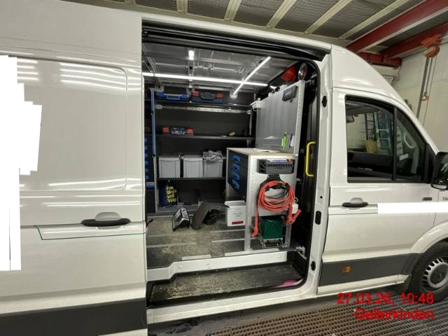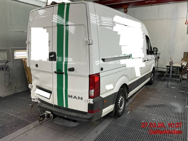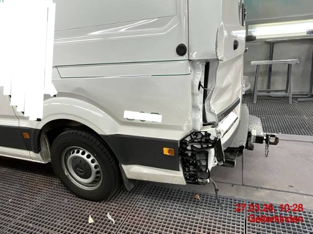 Beschreibung der Schäden: Stossfänger mit Ecke und Aufnahme, Schliussleuchte link, Anhängerkupplung, Längsträger links, Heckblech, Ecksäule innen und aussen, Bodenblech hinten, Hecktüre links mit Scharnieren, Verkleidungsblech innen, Seifenspender, Querträger hinten, Abdeckung, Sortimo links hinten, Holzplatte, Dachkannte hinten, Dach hinten links, Seitenwand hinten und vorne, Dachecke links vorne deformiert/gebrochen/zerkratzt Sortimo im Laderaum wird ausgebaut und ist nicht Teil der Auktion