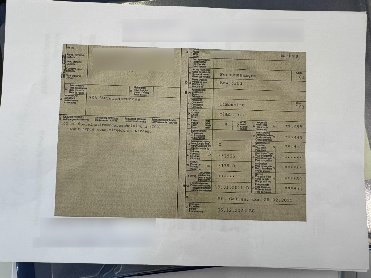 3-Punkt-Sicherheitsgurte auf allen Plätzen, Drehzahlmesser, Airbag: Seitenairbag für Fahrer und Beifahrer, Weisse Blinkleuchten, Veloursfussmatten vorne und hinten, Lenkrad: Lenkrad längs- und höhenverstellbar, Licht: Nebelschlussleuchte, Aktive Kopfstützen, Dynamische Stabilitätskontrolle (DSC), 3 Kopfstützen hinten, Assist: Dynamische Traktionskontrolle (DTC), Bordcomputer, Getriebe: 6-Gang-Getriebe, Window-Kopfairbags, Dekor: Interieurleisten in Satinsilber matt, Partikelfilter und Oxydationskatalysator, Sitzbelegungserkennung für Beifahrersitz, Scheibenwischer vorne mit Intervall, Exterieurumfänge in Wagenfarbe, Radiovorbereitung, Scheibenantenne, Ent- störung und 6 LS, Nichtraucherausführung, Stoff-Ausstattung, Vordersitze mechanisch längsverstellbar, AUX-Anschluss, Gurtstraffer vorne und hinten, Vordersitze höhenverstellbar, Radio BMW Business CD, Heckscheibenheizung, Lichtwarnsummer, Aussentemperaturanzeige, Grün getönte Scheiben, ISOFIX Kindersitzvorrichtung, Wegfahrsperre elektronisch, Verchromtes Auspuffendrohr, Tageskilometerzähler, Abblendlichtausschaltverzögerung 'Follow me home', Beleuchtetes und abschliessbares Handschuhfach, Dynamische Bremsleuchten, Windschutzscheibe aus Verbundglas, Lenkung, elektrisch unterstützt, Assist: Cornering Brake Control (CBC), Nebelscheinwerfer, Reifenkontrollanzeige, Verbandskasten, Klima: Klimaanlage, Leuchtweitenregulierung von innen, Bremsassistent (BAS), Digital Uhr, Wartungsintervall-Anzeige, Bremsbelag-Verschleissanzeige, Mittelarmlehne vorne, Lenkrad: Multifunktionslenkrad, Start-/Stop-Knopf, Elektrische Fensterheber vorne + hinten, Airbag: Airbag Fahrer und Beifahrer, Aussenspiegel rechts und links beheizt und elektrisch verstellbar, asphärisch gewölbtes Spiegelglas, Seitenaufprall-Schutzsystem, BMW Mobility System, Stossstangen und Aussenspiegel in Wagenfarbe, Antiblockiersystem (ABS), Drittes Bremslicht, Radzierblenden, Tagfahrlicht, Check-Control-System, Ambientebeleuchtung, Stahlräder, Brillenablage, Oelstandsanzeige, Befestigungsösen im Laderaum, Schalthebelknauf in Leder, Lackierung: Uni-Lackierung, Abschliessbare Radschrauben, Lederlenkrad, Lederhandbremshebel, Zentralverriegelung mit Fernbedienung