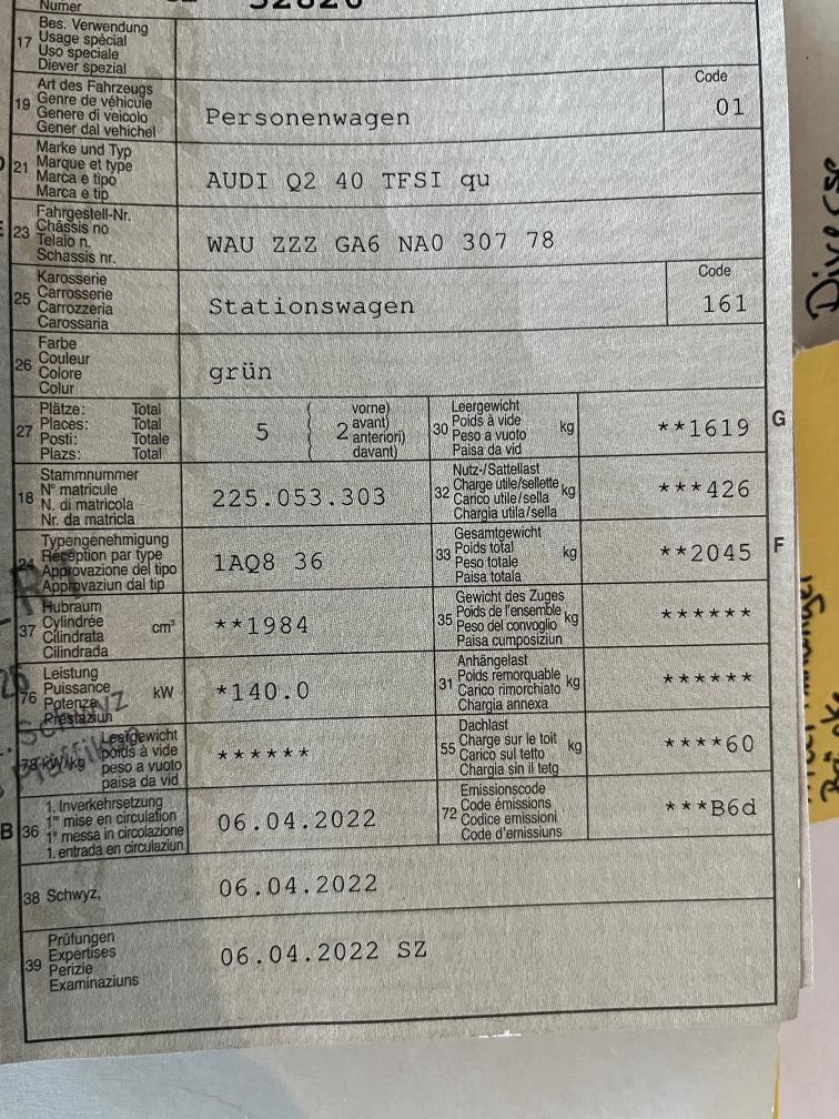 CH-Fahrzeug in nahezu perfektem Zustand aus 1. Hand (Leasingrückläufer) Fahrzeug ist nahezu Voll ausgestattet, Neupreis CHF 67500.- Hat 3 Parkdellen & einen etwas grösseren Steinschlag in der Frontscheibe, jedoch ausserhalb des Sichtfeldes. Winterreifen ca. 3mm, Sommerreifen ca. 4-4.5mm Am Fahrzeug wurde kein Werkstatttest gemacht (Für sichtbare oder nicht sichtbare Mängel wird nicht gehaftet). Wir testen & kontrollieren nicht alle Funktionen des Fahrzeugs. Das Risiko liegt somit vollumfänglich beim Käufer. Ab Platz ohne Garantie, Wandelung und Minderung werden wegbedungen. Am Fahrzeug wurde kein Werkstatttest gemacht (Für sichtbare oder nicht sichtbare Mängel wird nicht gehaftet). Wir testen & kontrollieren nicht alle Funktionen des Fahrzeugs. Das Risiko liegt somit vollumfänglich beim Käufer. Ab Platz ohne Garantie, Wandelung und Minderung werden wegbedungen.