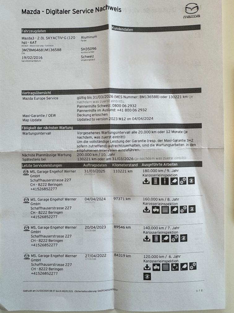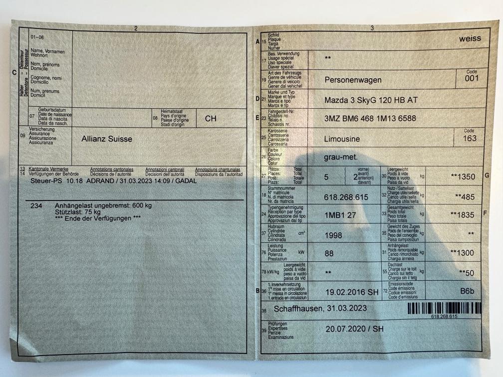 Wurde regelmässig gewartet. Abnehmbare Anhängerkupplung. Sommerräder mit Alufelgen. Winterräder mit Stahlfelgen. MFK wäre fällig. Steinschlag in Frontscheibe bereits bei Versicherung angemeldet. Schadennummer vorhanden. Kein Werkstatttest durchgeführt. Dem Kunden sind keine Mängel bekannt, fährt noch regelmässig damit.