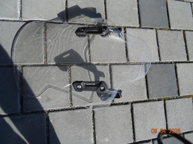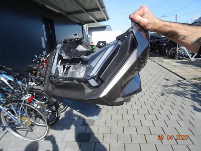 Fussraste hinten links, Bremshebel links, Aussenspiegel links, Scheinwerfer, Schinwerfer-Verschalung gerissen, Windscheibe zerkratzt