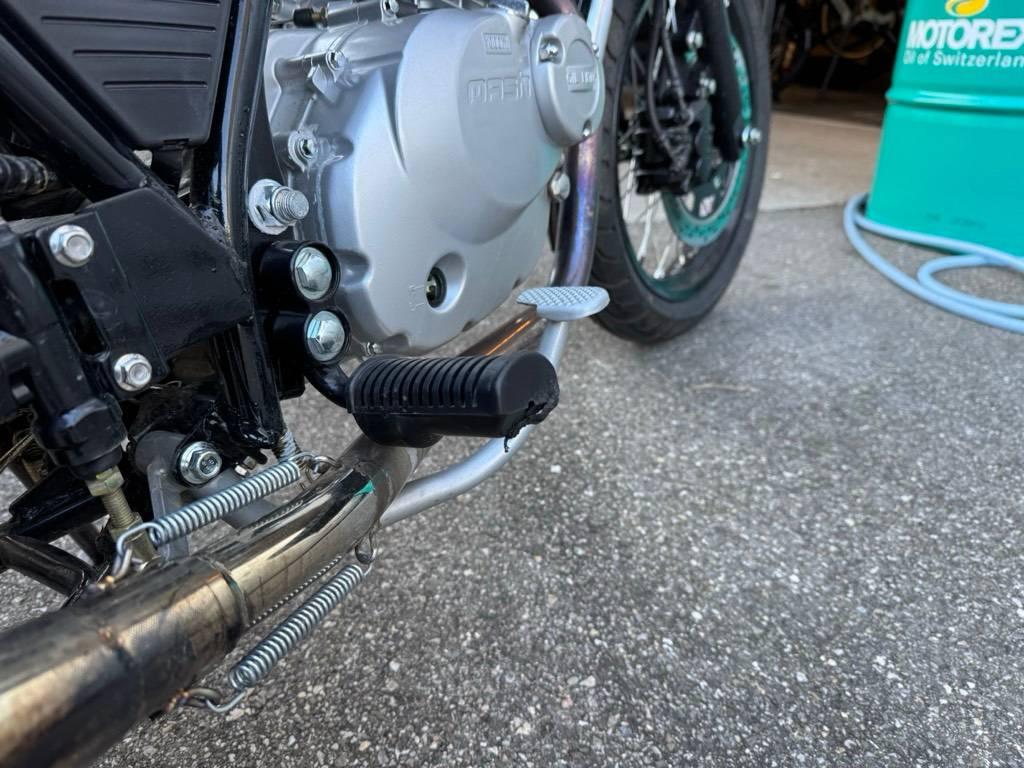 Armaturen, Auspuffkollektor, Auspufftopf, Aussenspiegel links, Aussenspiegel rechts, Diverse Anbauteile, Fussraster rechts, Gabelholm, Griff rechts, Heckverkleidung, Kupplungsgehäuse, Lenker, Rad hinten, Rad vorne, Rücklicht rechts, Schwinge, Verschalungen rechts