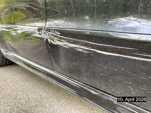 Beschreibung der Schäden: Seite rechts; Kotflügel, Türe vorne und hinten, Schwelle, Seitenwand, Felge hinten und Stossstange hinten eingedrückt und zerkratzt Vorbestandene Schäden: Alle Bereiche: Hagel rund ums Fahrzeug