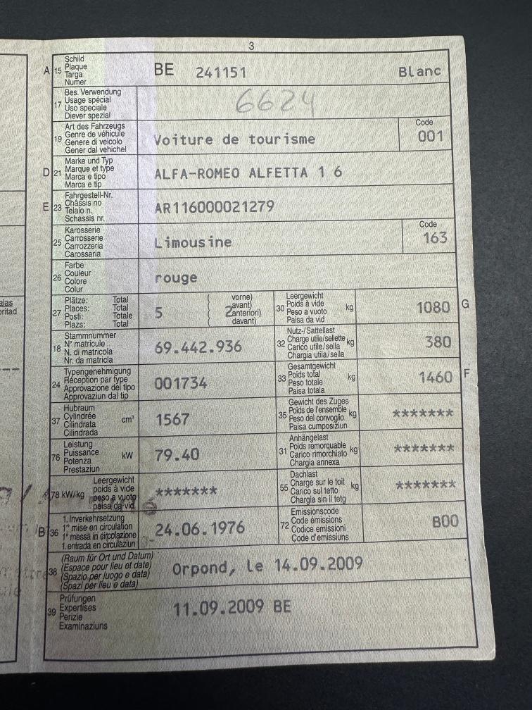 Das Auto ist sehr lange gestanden und braucht einen grossen Service. Der Motor Läuft, die Vergaser sollten eingestellt werden. Der Alfa hat diverse Gebrauchspuren und Beulen. Er wurde stellenweise nachlackiert. Der Lack ist nicht wirklich schön und sollte stellenweise erneuert werden. Serviceheft fehlt, Ausweis vorhanden. Der Ausweis wurde im Dez. 2009 annuliert, seit dann steht das Fahrzeug. Km Stand gem. Tacho (nicht nachvollziehbar)