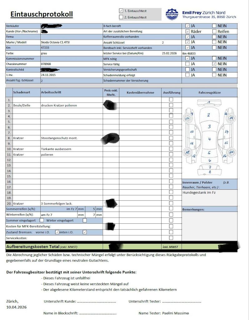 Keine Gewähr auf die Angaben der Sonder- und Serienausstattung / keine mechanische Prüfung. Fahrzeug wurde unzerlegt expertisiert / keine Haftung für allfällige, nach Demontage bekanntwerdenden Mängel. Fahrzeugbereifung und Ausstattung gemäss Fotos / Fahrzeugkauf auf eigenes Risiko ab Platz ohne Nachwährschaft.- Div. Kratzer und Dellen am gesamten Fahrzeug- Türkane ausbessern-Stossstangeschutz verkratzt- Rechte seitenspiegel verkatzt- Hat noch eine AHK unter der Ablage im Kofferraum- S-Räder sind im Fahrzeug- Letzter Service 25.02.2026 Km 46833