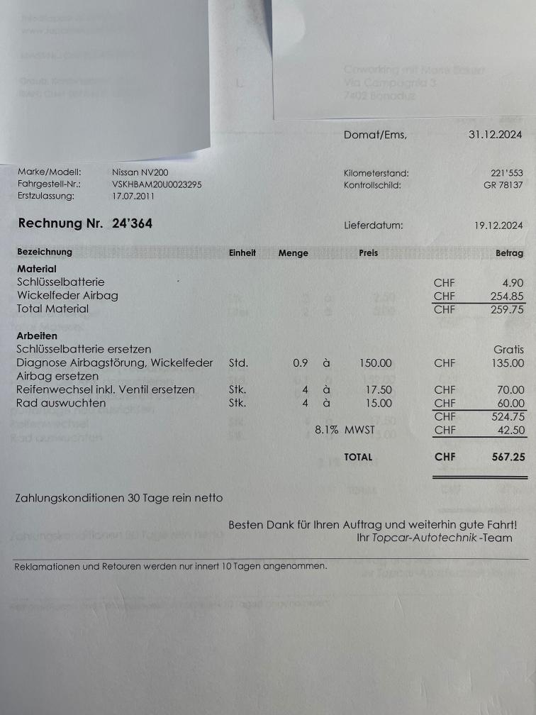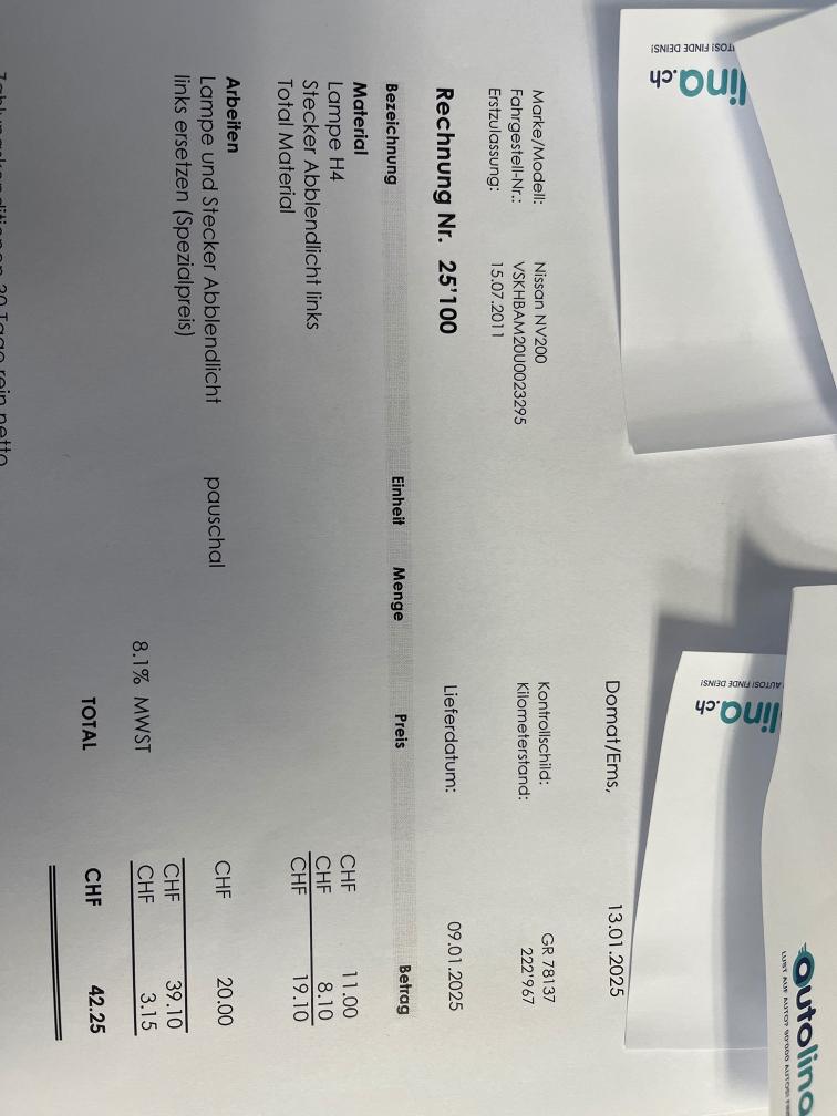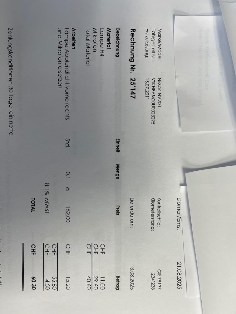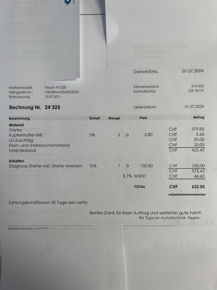 Fällig: -MFK -Service -Kupplung funktioniert, FZ ist fahrbar aber müsste langfristig ersetzt werden. -starter im 2024 ersetzt -auspuffendrohr repariert im märz 2025 -mikrofon eingebaut für freisprechanlage -FZ hat keine technischen MFK Mängel, ist eingelöst. -Abholung bis 20.04.26 in Bonaduz (GR)