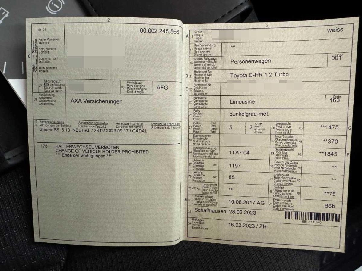 3-Punkt-Sicherheitsgurte auf allen Plätzen, Info-Display, ISOFIX Kindersitzvorrichtung, Laderaumbeleuchtung, Gurtstraffer vorne, Licht: Halogenscheinwerfer, Media: Multimedia Audiosystem Toyota Touch 2, Airbag: Airbag Fahrer und Beifahrer, Spurwechselwarnung, Automatisches Fernlicht, Höhenverstellbare Gurten vorne, Media: Bluetooth Freisprecheinrichtung, Media: 6 Lautsprecher, Start-/Stop-Automatik, Licht: Drittes Bremslicht, Räder: Leichtmetallfelgen 17J mit Pneu, Licht: Nebelscheinwerfer, Assist: Geschwindigkeitsbegrenzer, Wegfahrsperre elektronisch, Bremsassistent (BAS), Aussenspiegel rechts und links beheizbar und elektrisch verstellbar, Assist: Kollisionswarnung, Media: Digitaler Radioempfang (DAB/DAB+), Heckscheibenheizung, Elektrische Fensterheber vorne + hinten, Innenraumlicht-Paket, Regensensor für Scheibenwischer vorne, Teppichfussmatten, Licht: Umgebungsausleuchtung (Follow me home), Assist: Rückfahrkamera, Handschuhfach, Klima: Klimatisierungsautomatik, Getönte Scheiben, Kopfstützen vorne höhenverstellbar, Türgriffe aussen in Wagenfarbe, Sitze: Rücksitzlehne geteilt abklappbar, Servolenkung geschwindigkeitsabhängig, Licht: LED-Tagfahrlicht, Innenspiegel automatisch abblendbar, Lenkrad: Lenkradfernbedienung, Dämmerungssensor, Scheibenwischer vorne mit Intervall, Pollenfilter (Staubfilter), Media: USB-Anschluss, Gurtstraffer mit Gurtkraftbegrenzer, Katalysator geregelt, Lenkrad: Lenkrad längs- und höhenverstellbar, Assist: Müdigkeitserkennung, Gurtkontrolle, Airbag: Airbag Beifahrer deaktivierbar, Zentralverriegelung mit Fernbedienung und automatischer Türverriegelung, Blinker in Aussenspiegel, Sitze: Fahrersitz höhenverstellbar, Airbag: Window-Kopfairbags, Airbag: Seitenairbag für Fahrer und Beifahrer, Media: Wifi, Drehzahlmesser, Kopfstützen hinten höhenverstellbar, ABS, EBD elektronische Bremskraftverteilung, Polster: Stoff-Ausstattung, Aussentemperaturanzeige, Laderaumabdeckung, herausnehmbar, Elektronisches Stabilitäts-Programm mit Anhängerstabilisierung (ESP), Räder: Reifenreparatur-Set, Multifunktionsanzeige, Lenkrad: Lederlenkrad, Sonnenblende Fahrer und Beifahrerseite mit beleuchtetem Spiegel, Licht: Nebelschlussleuchte, Assist: Berganfahrhilfe (Hill Assist Control - HAC), Assist: Adaptiver Tempomat ACC, Aussenspiegel in Wagenfarbe, Stabilitäts- und Traktionskontrolle (VSC und TRC), Getriebe: 6-Gang-Getriebe, 4 Scheibenbremsen, Tageskilometerzähler, Mittelkonsole mit Ablagefach, Lackierung: Uni-Lackierung, Digital Uhr, Heckscheiben-Wisch-/Waschanlage, Airbag: Knie-Airbag für Fahrer, Assist: Verkehrsschild-Erkennungssystem, Assist: Fussgängerschutz, Räder: TPMS Reifendrucküberwachungssystem