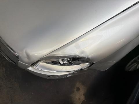 Front links eingedrückt. Fahrzeugvorbau nach rechts verschoben.