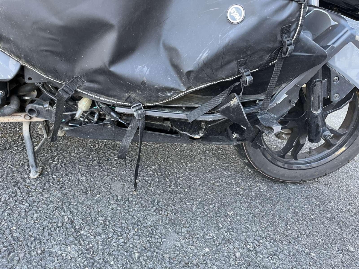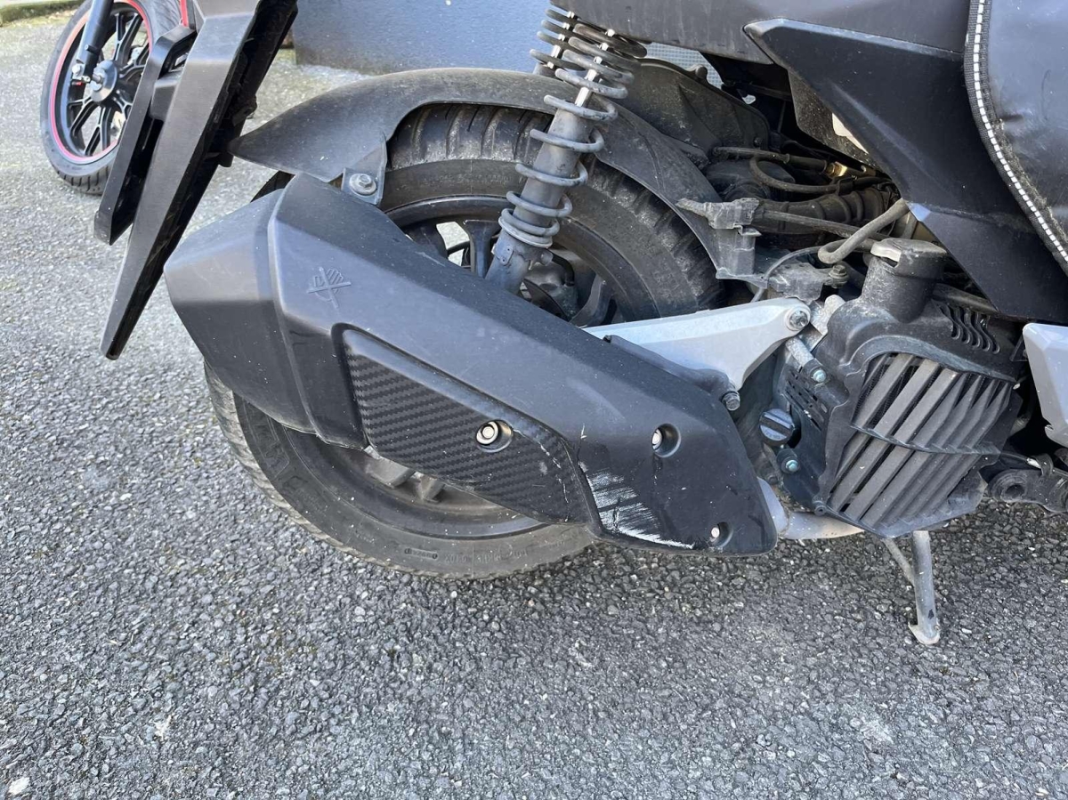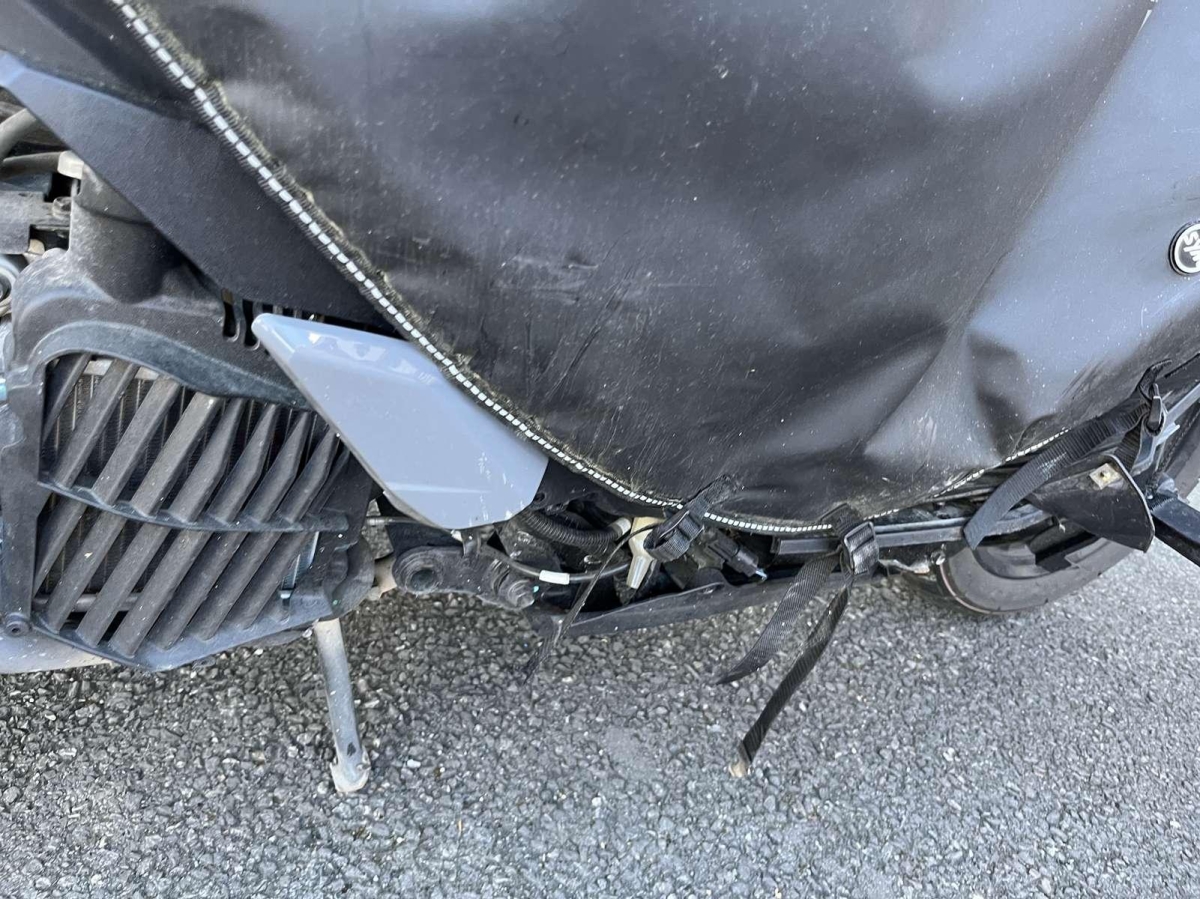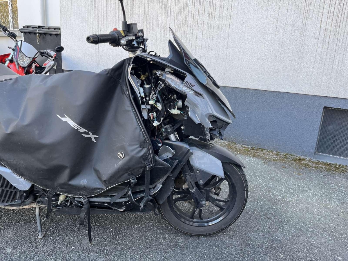 Choc avant droit : Face avant, tablier intérieur, phare avant, fourche, bas de caisse droit, repose pied, cadre, couverture, pare chaleur échappement endommagés et cassés.