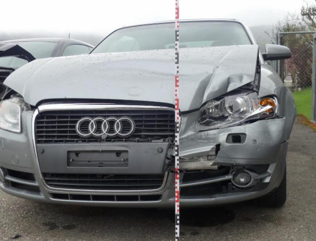 Front eingedrückt. Front links eingedrückt. Motorhaube eingedrückt. Frontblech/Maskenblech eingedrückt.