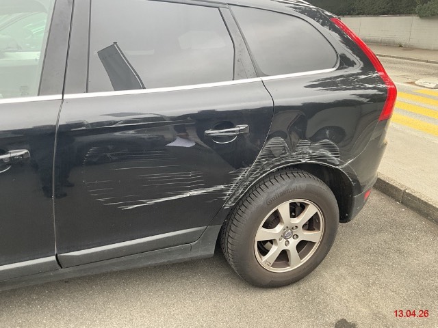Beschreibung der Schäden: Seitenwand und Türe HL eingedrückt. Stange Kratzer und Blenden unten Kratzer. Vorbestandene Schäden: Vorne links: Türe VL PS 2 Dellen