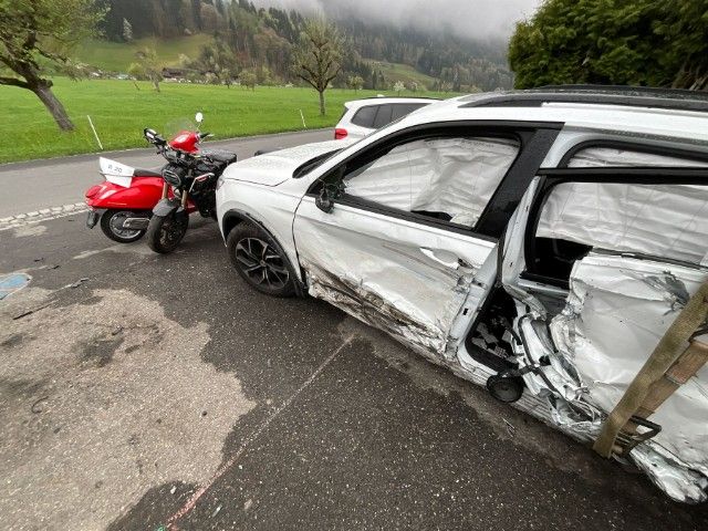 Vorderachse ist beschädigt. Hinterachse links beschädigt. Risiko Lenkung. Motoraufhängung/Aggregateträger ist beschädigt.