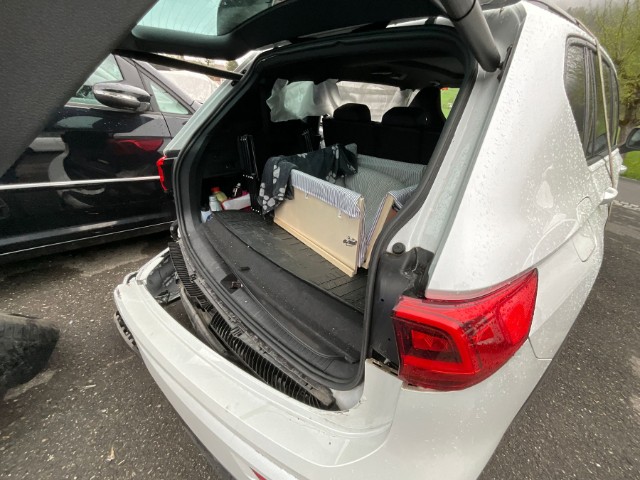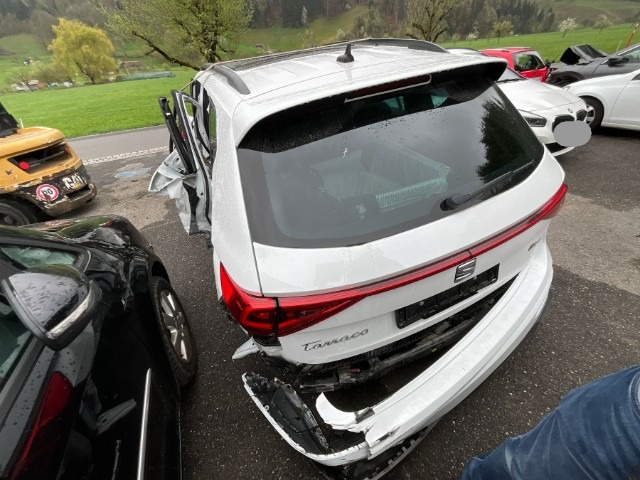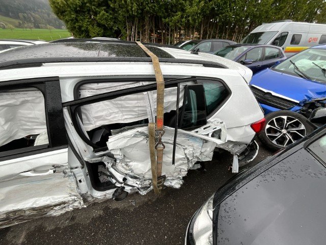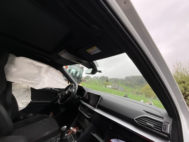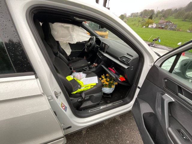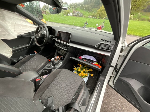 Armaturenbrett ist beschädigt. Gurtstraffer ausgelöst. Gurtstraffer vorne ausgelöst. Gurtstraffer hinten ausgelöst. Dachhimmel gerissen. Innenraum ungepflegt. Sitz vorne links defekt. Starke Verschmutzung im Innenraum. Tierhaare und Geruch im Fahrzeug