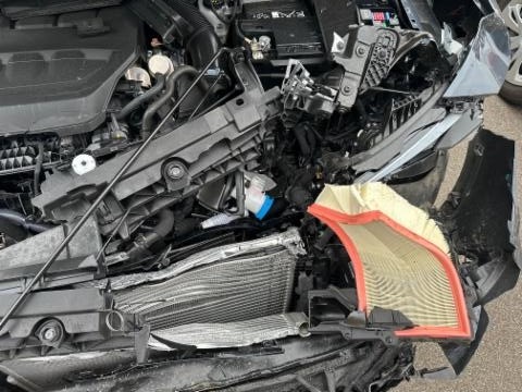 Vorderachse ist beschädigt. Aufhängungsteile vorne links beschädigt. Aufhängungsteile vorne rechts beschädigt. Lenkgetriebe ist beschädigt. Motoraufhängung/Aggregateträger ist beschädigt.
