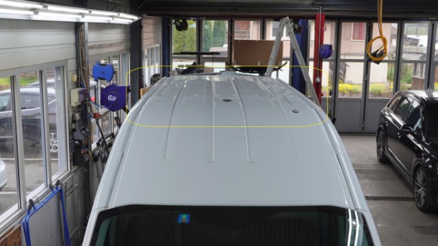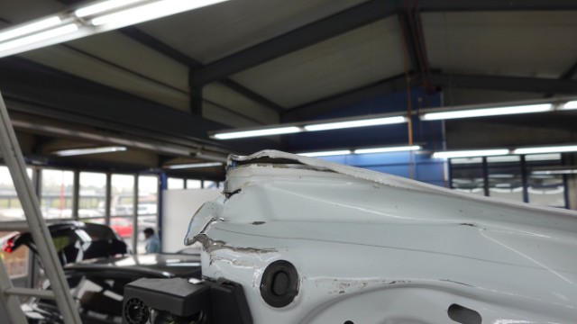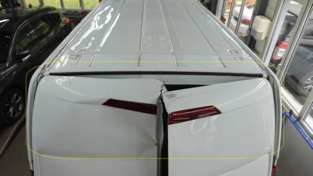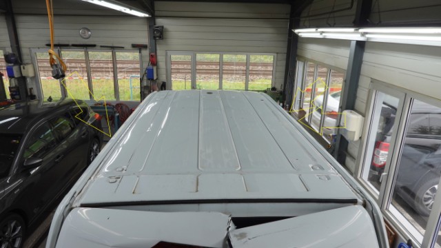 Beschädigung Dachblech eingedellt und verformt. Hinteres Dachblech eingedellt und verformt. Dachrahmen links und rechts eingedellt und verformt. Dach-Querträger 1 und 2 gestaucht. Hecktüre links und rechts im oberen Bereich eingedellt, verformt und abgerissen. Dachantenne, Antennenfuss und Zusatzantenne gerissen. Zusatzbremsleuchte oben gebrochen.