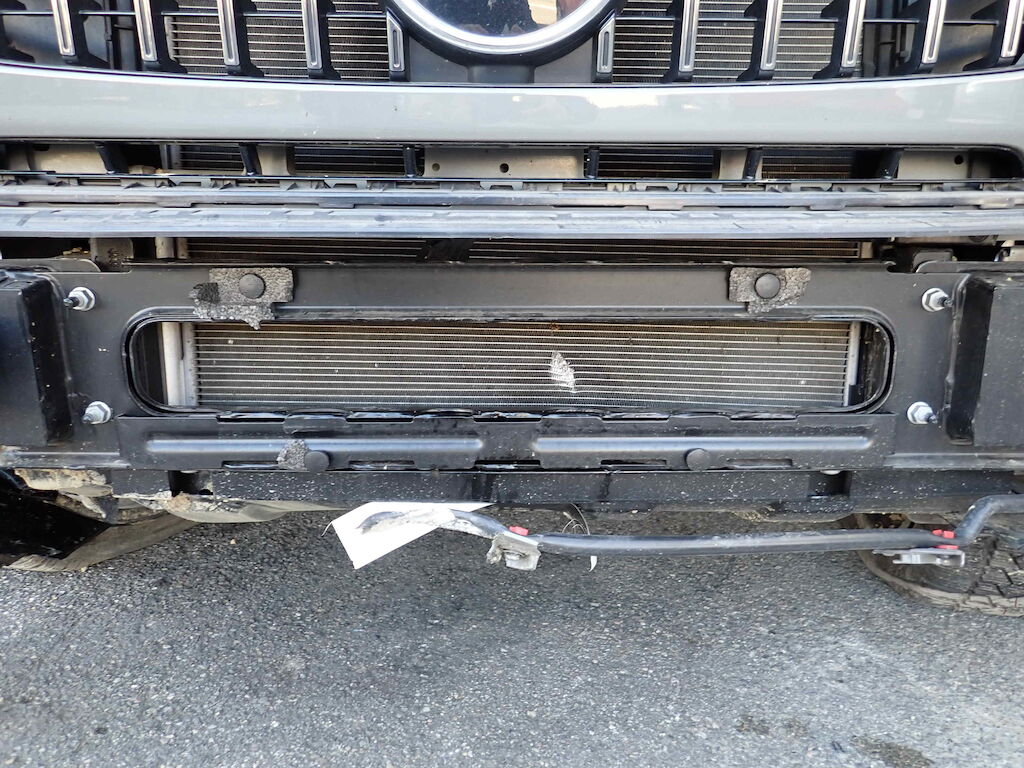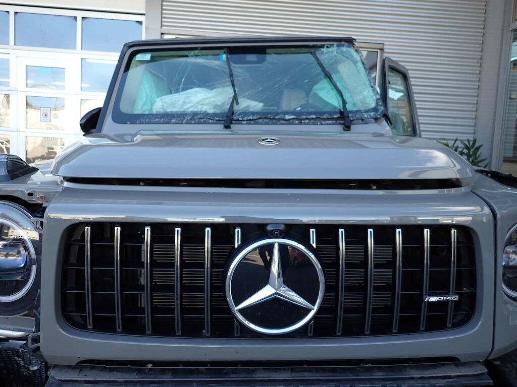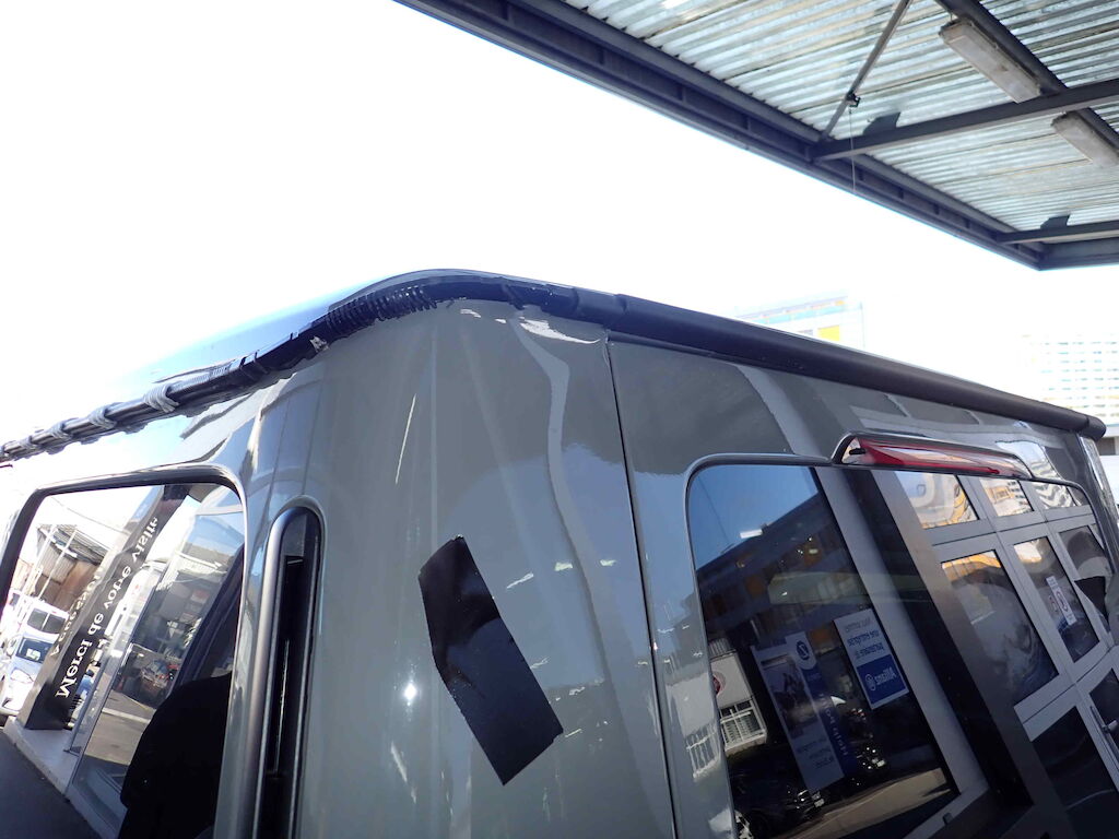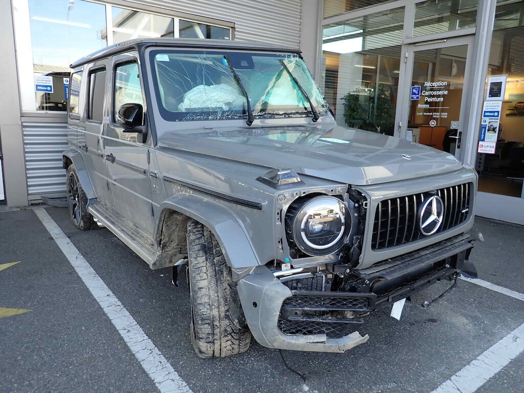 Choc avant + chute sur flanc gauche: pare-chocs, cache et grilles de pare-chocs, traverse, radiateurs, capot moteur, calandre, phares, ailes avec élargisseurs, pare-brise, marche-pied, rétroviseur, caisse cpl avec pavillon, portes, vitres, jantes, berceau et suspension, direction, airbags, ceintures, moteur (bloqué). Motor Getriebe Vorderachse Hinterachse Airbags ausgelöst: 0 unbekannt ( Abfallcode 16.01.04ak )