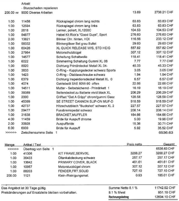 Kalkulation nicht abschliessend, unzerlegt besichtigt und aktuelle Berechnung übersteigt Fahrzeugwert