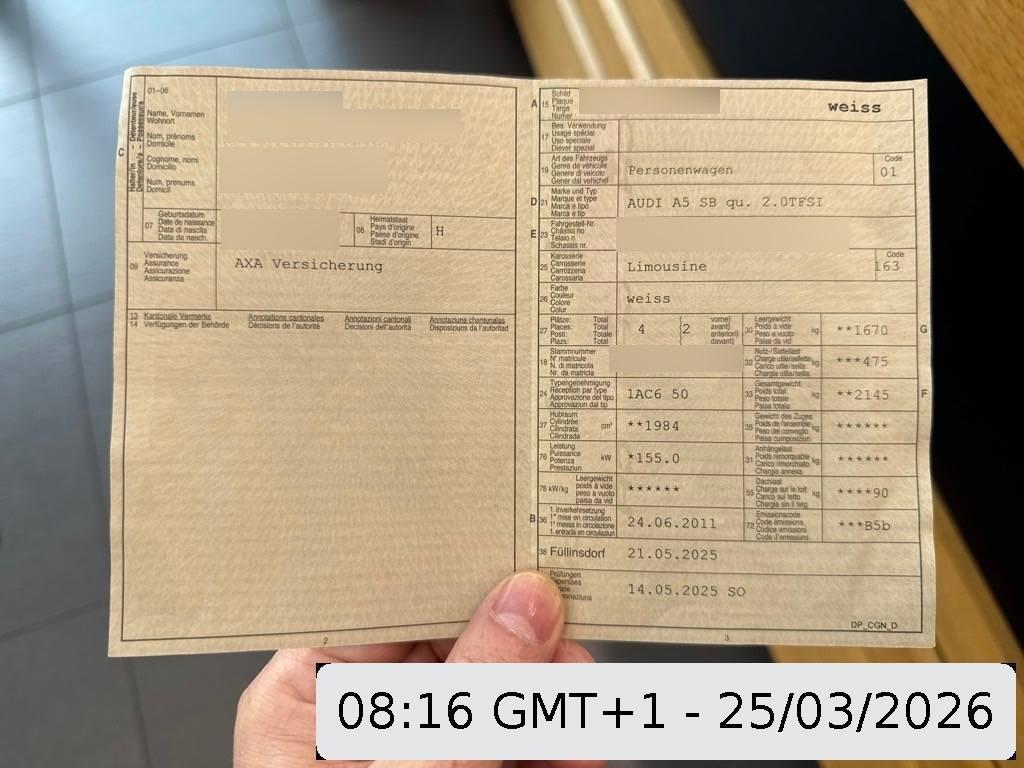 Scheinwerfer-Waschanlage, Zentralverriegelung mit Fernbedienung, Seitenairbag für Fahrer und Beifahrer, Rücksitzlehne geteilt abklappbar, Aussenspiegel rechts und links beheizt und elektrisch verstellbar, asphärisch gewölbtes Spiegelglas, Tempomat, Sitze: Vordersitze höhenverstellbar, Aussentemperaturanzeige, Multifunktions-Sportlederlenkrad 3-Speichen, Elektronische Differentialsperre (EDS), Fahrwerk: Dynamisches Fahrwerk, Elektrische Fensterheber vorne + hinten, Scheibenwaschdüsen beheizt, Seitenaufprall-Schutzsystem, Brillenablage, Gurtstraffer vorne, Nebelscheinwerfer, Garantie: 2 Jahre ohne Kilometerbegrenzung (ab 1. Inv.) mit ASSP+ - Audi Swiss Service Package Plus - 3 Jahre bzw. 100'000 km Reparaturen kostenlos: Service kostenlos bis 100'000km, max. 10 Jahre (ab 1. Inv.), Xenon Plus-Scheinwerfer, Wartungsintervall-Anzeige, Aschenbecher und Zigarettenanzünder, Innenlicht-Abschaltverzögerung, Klima: Pollenfilter (Staubfilter), Fensterschachtzierleisten in Aluminium, Scheibenwischer vorne mit Intervall, Katalysator geregelt, Digital Uhr, Wegfahrsperre elektronisch, Wärmeschutzverglasung, Räder: Reifendruck-Kontrollanzeige, Elektronisches Stabilitäts-Programm (ESP), Airbag: Window-Kopfairbags, Cupholder vorne, S-tronic, sequentielles 7-Gang-Getriebe DSG mit Automatikfunktion, Antriebsschlupfregelung (ASR), Antiblockiersystem (ABS), Teppichfussmatten vorne und hinten, Leuchtweitenregulierung elektrisch, Drehzahlmesser, Lenkrad: Lenkrad längs- und höhenverstellbar, Klima: Klimatisierungsautomatik, Airbag: Airbag Fahrer und Beifahrer, Durchladesystem inkl.Skisack, Licht: LED Heckleuchten, Leseleuchten vorne, Elektronische Parkbremse, Notrad, Radio Chorus, Autobahnblinkfunktion, Licht: LED-Tagfahrlicht, Assist: Bremsassistent (BAS), Polster: Stoff-Ausstattung, Alu-Räder 7.5Jx17 im 6-Arm-Design, Servotronic, Mittelarmlehne hinten, Dekoreinlagen Micrometallic platin, Sitze: Vordersitze heizbar, Fahrer-Informationssystem, Allradantrieb permanent, Höhenverstellbare Gurten vorne