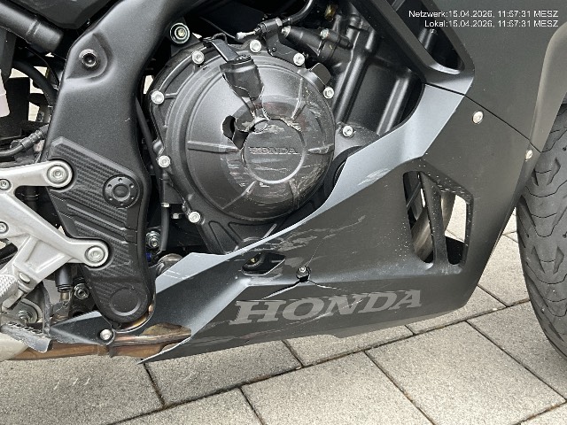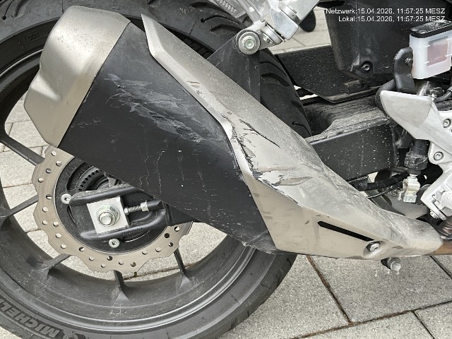 Beschreibung der Schäden: Seitenschaden rechts : Auspuff, Bremshelbel und Fussraster deformiert und zerkratzt. Motorgehäuse und Seitenverkleidung vorne gebrochen und zerkratzt. Seitenschaden links : Lenker und Schalthebel deformiert. Beide Blinker und Fussraster gebrochen. Seitenverkleidungen, Aussenspiegel, Lenkergewicht, Bremsgriff, Motorgehäuse und Schwinge zerkratzt. Vorbestandene Schäden: