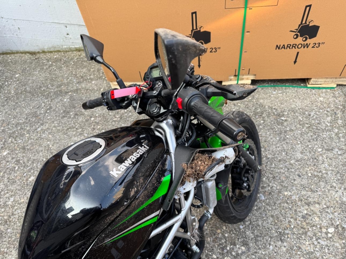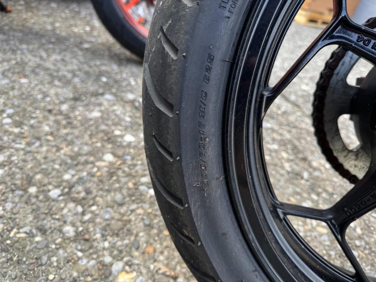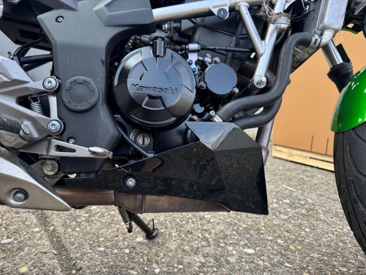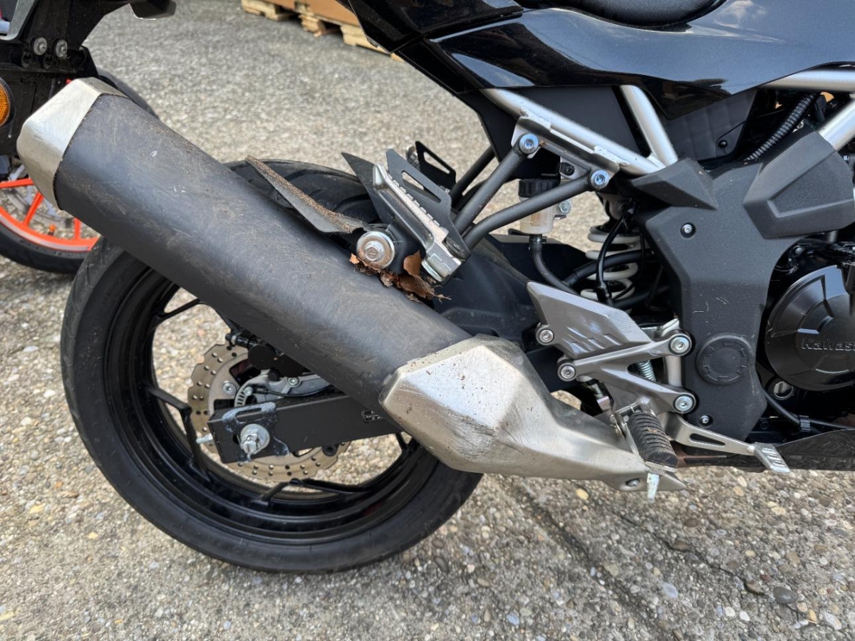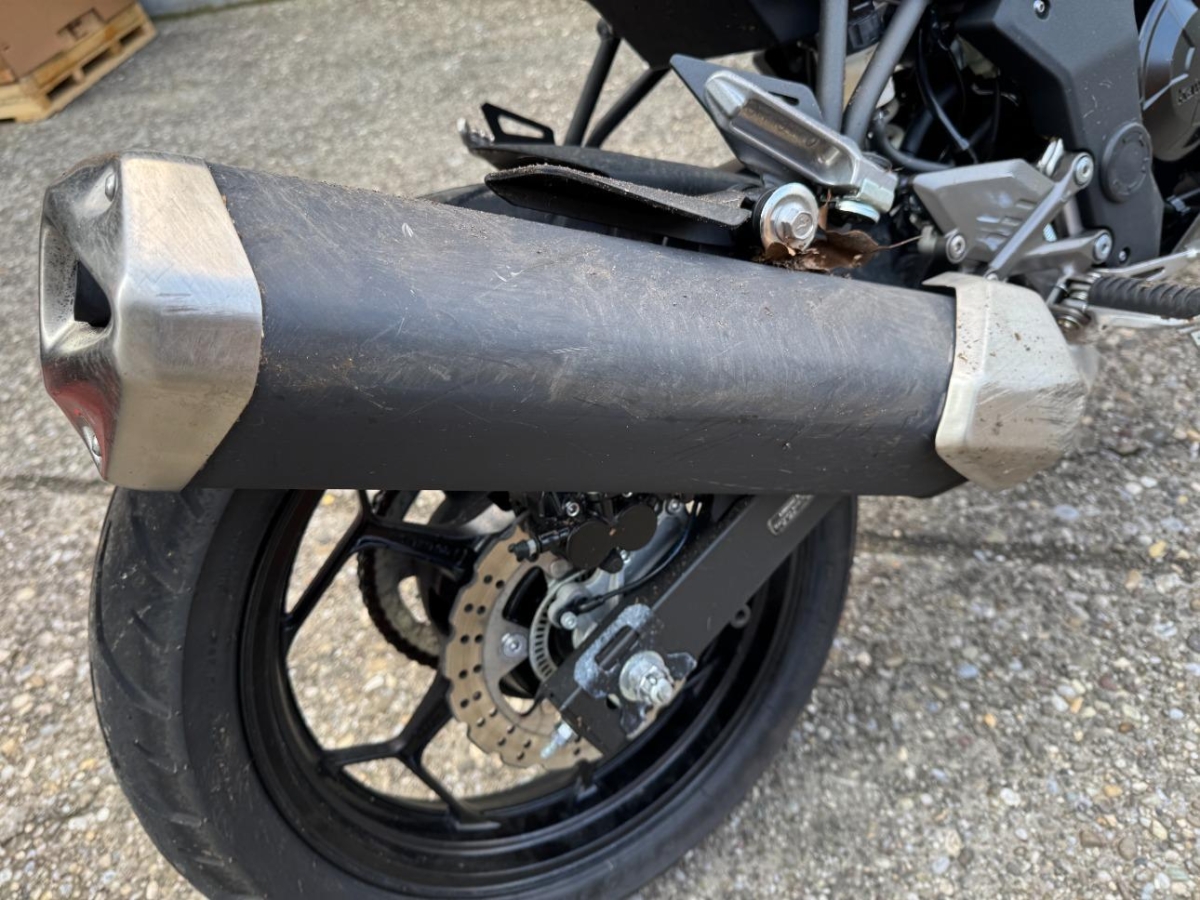 Auspufftopf, Aussenspiegel rechts, Diverse Anbauteile, Front, Fussraster rechts, Gabelholm, Griff rechts, Heckverkleidung, Kühler, Lenker, Rad vorne, Scheinwerfer, Schutzblech vorne, Schwinge, Seite rechts, Tank, Verschalungen rechts, Verschalungen vorne