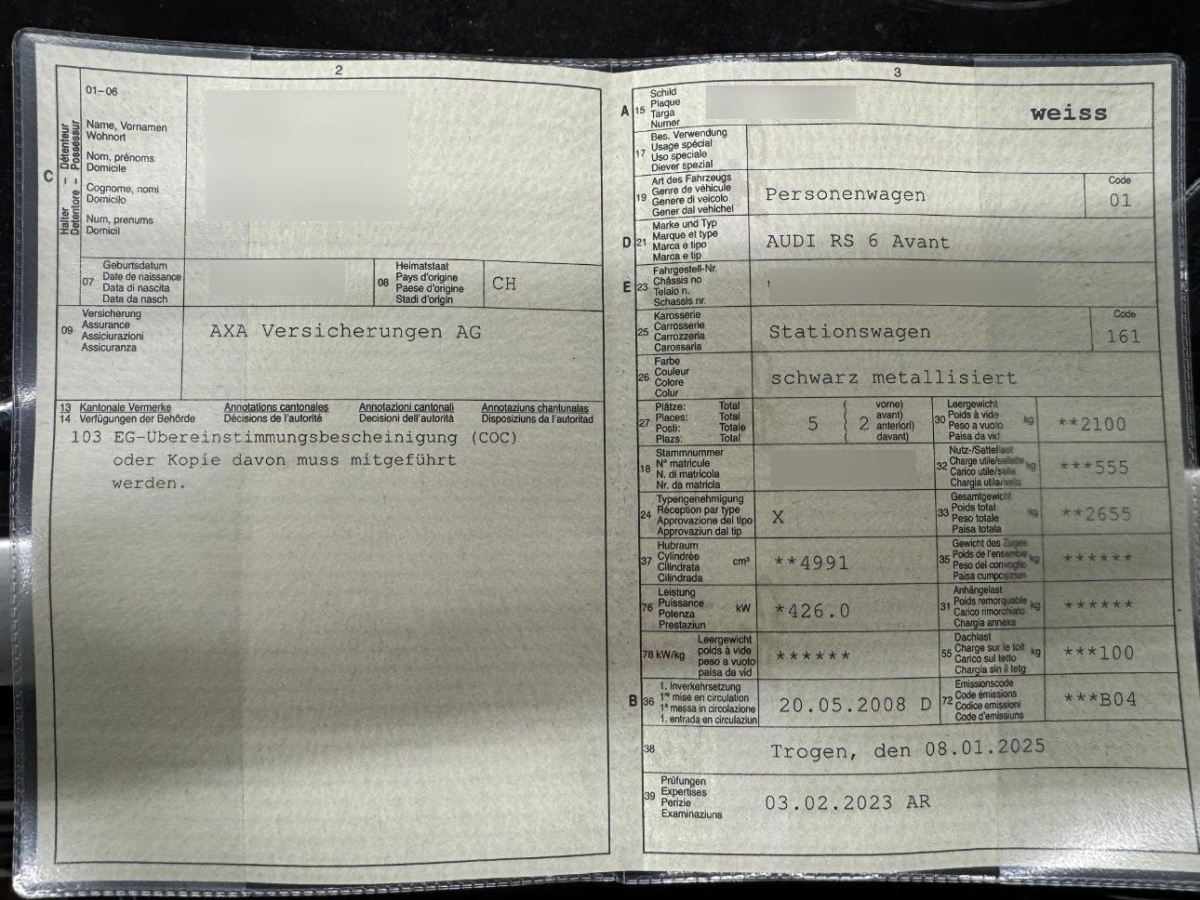 Kreuzstützen für Vordersitze elektrisch verstellbar, Dachreling Alu-Look, Mittelarmlehne vorn in Kunstleder schwarz mit Kontrastnaht in Rot, Bremsscheiben gelocht, Bremssättel dunkelgrau lackiert, Fahrwerk: Sportfahrwerk, Elektrische Fensterheber vorne + hinten, Vorder- und Rücksitze heizbar, Licht: Tagfahrlicht, Aschenbecher vorne und hinten, Seitenschwellerverbreiterung in Wagen- farbe lackiert, Wassertemperaturanzeige, Licht: Drittes Bremslicht, 3-Punkt-Sicherheitsgurte auf allen Plätzen, Laderaumabdeckung, Aussentemperaturanzeige, Schienensystem im Laderaum mit variablen Verzurrösen, Leichtmetallräder im 10 Speichen-Design 19J, 6-Stufen-Automat Tiptronic, Tempomat, Sportbremsanlage, Antriebsschlupfregelung (ASR), Servotronic, Gurtstraffer vorne, Elektronisches Stabilitäts-Programm (ESP), Alcantara-/Leder-Ausstattung, Elektrisch verstellbares Lenkrad, Tageskilometerzähler, Kotflügelverbreiterung, Assist: Park Distance Control vorne und hinten, 3 Kopfstützen hinten, Mittelarmlehne hinten, Assist: Bremsassistent (BAS), Vordersitze elektrisch verstellbar, Fahrersitz mit Memory-Funktion, Navigationssystem plus DVD + MMI high, Beleuchtetes Handschuhfach, Bose Surround Soundsystem, Fahrlichtautomatik, Cupholder vorne, Bordcomputer, Ausstiegsleuchten in den Türen, Elektronische Differentialsperre (EDS), Teppichfussmatten vorne und hinten, Dachhimmel schwarz, Klima: Pollenfilter (Staubfilter), Leseleuchten hinten, Adaptive light, Xenon-Plus-Scheinwerfer, Höhenverstellbare Gurten vorne, CD-Wechsler im Armaturenbrett für MMI high, Carbon Applikationen, MMI high, Regensensor für Scheibenwischer vorne, Tiptronic-Multifunktions-Lederlenkrad, 3-Speichen, Leseleuchten vorne, Aussenspiegel in Alu, Innenspiegel automatisch abblendbar, Abschliessbare Radschrauben, Klima: Klimatisierungsautomatik, Beide Make up-Spiegel beleuchtet, Wegfahrsperre elektronisch, Zigarettenanzünder, Zentralverriegelung mit Fernbedienung, Aussenspiegel mit Memory, elektrisch anklappbar, automatisch abblendend, Digital Uhr, Bremsbelag-Verschleissanzeige, Nebelscheinwerfer, Räder: Reifendruck-Kontrollanzeige, Diebstahlwarnanlage mit Innenraum- überwachung, Scheinwerfer-Waschanlage, Scheibenwaschdüsen beheizt, Airbag: Airbag Fahrer und Beifahrer, Doppelter Ladeboden mit darunter liegender Schmutzwanne, Ablagenpaket, Allradantrieb permanent, Steckdose, Innenlicht-Abschaltverzögerung, Durchladesystem inkl.Skisack, Getönte Scheiben, Aluminium-Applikationen, Katalysator geregelt, Brillenablage, Licht: Nebelschlussleuchte, Scheibenwischer vorne mit Intervall, Lichtpaket, Heckscheibenheizung, Ladesicherungsnetz zum Gepäckraum, Heckscheiben-Wisch-/Waschanlage mit, Drehzahlmesser, Rücksitzlehne geteilt abklappbar, Leuchtweitenregulierung elektrisch, Antiblockiersystem (ABS), Fahrer-Informationssystem mit Farbdisplay, Seitenairbag für Fahrer und Beifahrer, Airbag: Window-Kopfairbags, Räder: Reifenreparatur-Set (Tire Fit), Elektronische Parkbremse, S Sportsitze