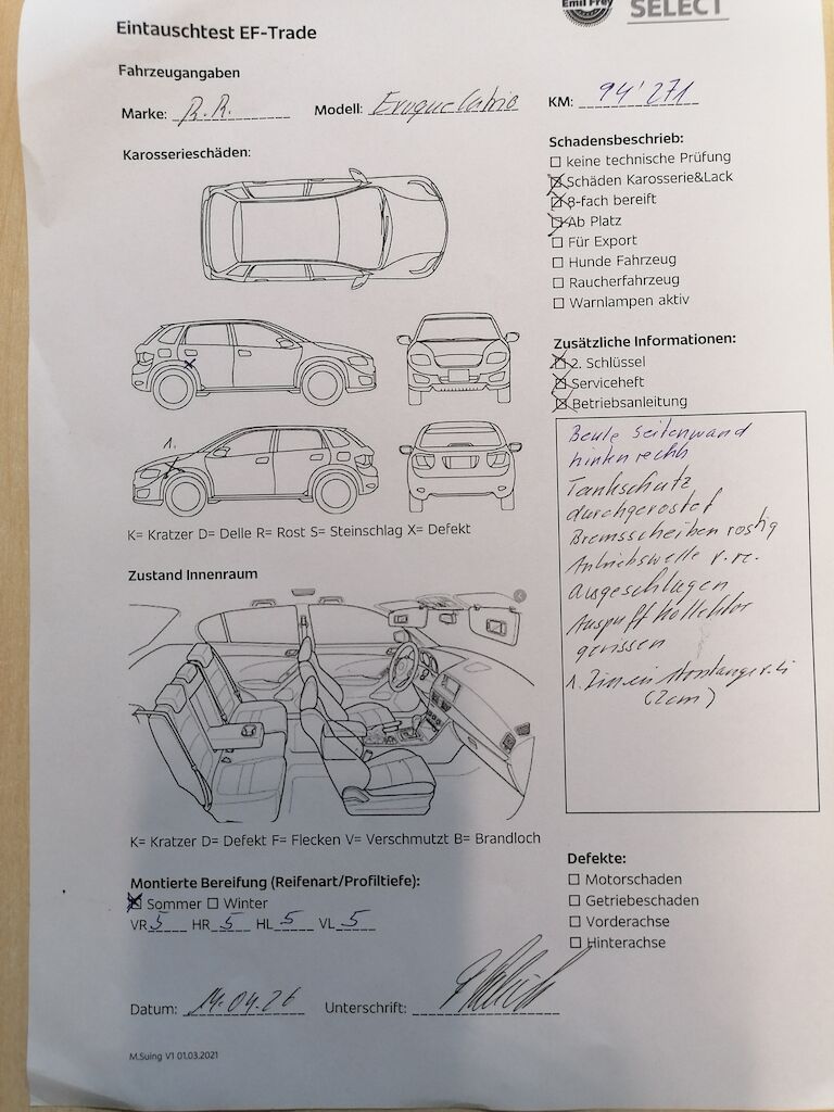 Keine technische Prüfung (Werkstatttest) vorgenommenDiverse Schäden an Karosserie/Lack.8-fach bereift.Fahrzeug ab Platz, ohne Garantie und Aufbereitung.DPF/FAP Filter nicht kontrolliertBeule Seitenwand hinten rechtsTankschutz durchgerostetBremsscheiben rostigAntriebswelle vorne rechts ausgeschlagenAuspuffkollektor gerissenRiss in Stossstange vorne links (2cm)